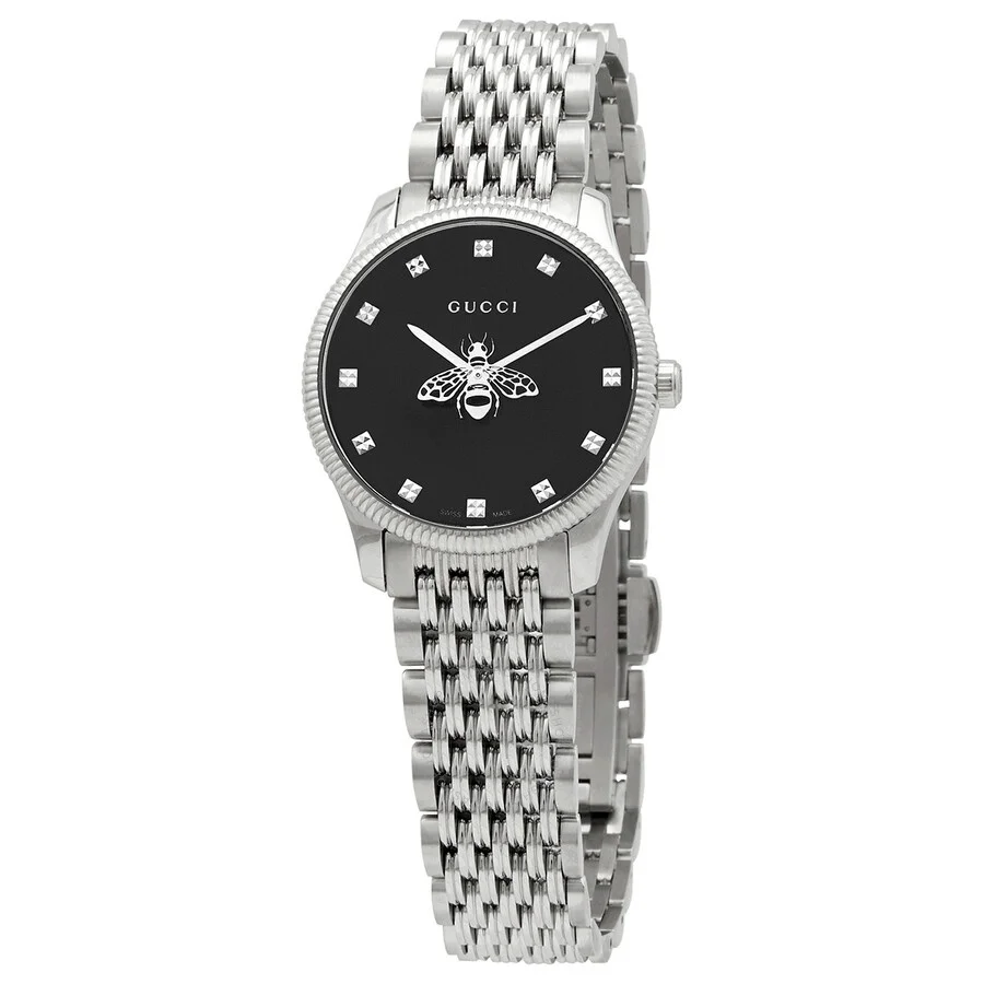 Stainless steel case with a stainless steel bracelet. Fixed stainless steel bezel. Black (bee) dial with silver-tone hands and index hour markers. Dial Type: Analog. Caliber ETA F04.105 quartz movement. Scratch resistant sapphire crystal. Pull / push crown. Solid case back. Round case shape. Case size: 29 mm. Case thickness: 8 mm. Band width: 14 mm. Fold over clasp with a push button release. Water resistant at 50 meters / 165 feet. Functions: hour, minute. G-timeless Series. Dress watch style. Watch label: Swiss Made. Gucci Quartz Black Dial Ladies Watch YA1265020. GENERAL Box Type: Original Box Brand Type: Designer CASE Case Size: 29 Case Thickness: 8 mm Case Material: Stainless Steel Case Shape: Round Case Back: Solid BAND Band Material: Stainless Steel Band Type: Bracelet Band Color: Silver-tone Band Width: 14 mm Clasp: Fold Over with Push Button Release DIAL Dial Color: Black Type: Analog Crystal: Scratch Resistant Sapphire Hands: Silver-tone Dial Markers: Index Bezel: Fixed Bezel Color: Silver-tone Bezel Material: Stainless Steel Crown: Pull / Push INFORMATION Brand: Gucci Series: G-Timeless Collection Name: G-Timeless Gender: Womens Model: YA1265020 Watch Label: Swiss Made Movement: Quartz Engine: Caliber ETA F04.105 FEATURES Water Resistance: 50 meters / 165 feet Functions: Hour, Minute Watch Features: Analog, Stainless Steel ADDITIONAL INFO Watch Style: Dress Warranty: 2 Year Jomashop Warranty UPC Code: 731903479906 Jomashop Sku: GCYA1265020 Department: Watches Category: Watches