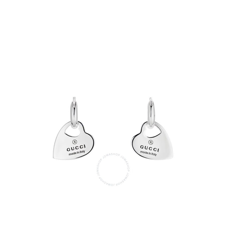 Gucci Ladies Earrings. Trademark series. SKU: YBD796302001. Color: Silver-tone. Metal Type: Sterling Silver. Metal Stamp: 925-Sterling. Gem stone type: None. Earrings style: 1 Band. Gucci Silver Hoop Earrings With Heart Pendants YBD796302001. GENERAL Color: Silver-tone Collection Name: Trademark INFORMATION Brand: Gucci Series: Trademark Gender: Womens Model: YBD796302001 DETAILS Earrings: 1 Band Material : Sterling Silver Metal Stamp: 925-Sterling ADDITIONAL INFO Jomashop Sku: GCYBD796302001 Department: Jewelry Category: Earrings