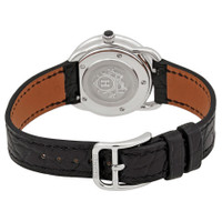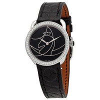 Stainless steel case with a black (alligator) leather strap. Fixed stainless steel bezel set with 56 diamonds. Black enamel (marquetry)) dial with silver-tone hands. No markers. Dial Type: Analog. Quartz movement. Scratch resistant sapphire crystal. Pull / push crown. Solid case back. Round case shape. Case size: 28 mm. Tang clasp. Water resistant at 30 meters / 100 feet. Functions: hour, minute. Additional Info: case set with 56 diamonds (0.45 ct). Arceau Cavales Series. Dress watch style. Watch label: Swiss Made. Hermes Arceau Cavales Quartz Black Dial Ladies Watch 045726WW00. INFORMATION Brand: Hermes Series: Arceau Cavales Collection Name: Arceau Cavales Gender: Womens Model: 045726WW00 Watch Label: CH Switzerland Movement: Quartz CASE Case Size: 28 mm Case Material: Stainless Steel Case Shape: Round Case Back: Solid BAND Band Material: (Alligator) Leather Band Type: Strap Band Color: Black Clasp: Tang DIAL Dial Color: Black Enamel (Marquetry)) Type: Analog Crystal: Scratch Resistant Sapphire Hands: Silver-tone Second Markers: No Markers Bezel: Fixed Bezel Color: Silver-tone Bezel Material: Stainless Steel set with 56 Diamonds Crown: Pull / Push FEATURES Water Resistance: 30 meters / 100 feet Functions: Hour, Minute Watch Features: Diamond, Stainless Steel, Leather, Analog, Alligator Leather ADDITIONAL INFO Watch Style: Dress Warranty: 2 Year Jomashop Warranty Additional Info: Case set with 56 diamonds (0.45 ct) Jomashop Sku: HS045726WW00 Department: Watches Category: Watches