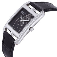 Stainless steel case set with diamonds (0.75 ct). Black alligator leather strap. Fixed bezel. Black dial. Dial Type: Analog. Quartz movement. Scratch resistant sapphire crystal. Pull / push crown. Solid case back. Square case shape, case size: 29 mm. Tang buckle clasp. Water resistant at 30 meters / 100 feet. Functions: hour, minute. Cape Cod Series. Dress watch style. Watch label: Swiss Made. Hermes Cape Cod Quartz Black Dial Ladies Watch 047237WW00. GENERAL Box Type: Original Box Brand Type: Designer CASE Case Size: 29 Case Material: Stainless Steel Set with Diamonds (0.75 ct) Case Shape: Square Case Back: Solid BAND Band Material: Alligator Leather Band Type: Strap Band Color: Black Clasp: Tang Buckle DIAL Dial Color: Black Type: Analog Crystal: Scratch Resistant Sapphire Hands: Silver-tone Second Markers: No Markers Bezel: Fixed Crown: Pull / Push INFORMATION Brand: Hermes Series: Cape Cod Collection Name: Cape Cod Gender: Womens Model: 047237WW00 Watch Label: Swiss Made Movement: Quartz FEATURES Water Resistance: 30 meters / 100 feet Functions: Hour, Minute Watch Features: Alligator Leather, Analog, Leather, Stainless Steel, Diamond ADDITIONAL INFO Watch Style: Dress Warranty: 2 Year Jomashop Warranty Jomashop Sku: HS047237WW00 Department: Watches