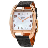 18kt rose gold case with a matte black (alligator) leather strap. Fixed 18kt rose gold bezel. White mother of pearl dial with rose gold-tone hands and Arabic numeral hour markers. Dial Type: Analog. Quartz movement. Scratch resistant sapphire crystal. Pull / push crown. Solid case back. Tonneau case shape. Case dimensions: 33 mm x 30 mm. Tang clasp. Water resistant at 30 meters / 100 feet. Functions: hour, minute. Cape Cod Series. Luxury watch style. Watch label: Swiss Made. Hermes Cape Cod Quartz White Mother of Pearl Dial Ladies Watch 037654WW00. INFORMATION Brand: Hermes Series: Cape Cod Collection Name: Cape Cod Gender: Womens Model: 037654WW00 Watch Label: Swiss Made Movement: Quartz CASE Case Size: 33 mm x 30 mm Case Material: 18kt Rose Gold Case Shape: Tonneau Case Back: Solid BAND Band Material: (Alligator) Leather Band Type: Strap Band Color: Matte Black Clasp: Tang DIAL Dial Color: White Mother of Pearl Type: Analog Crystal: Scratch Resistant Sapphire Hands: Rose Gold-tone Dial Markers: Arabic Numeral Bezel: Fixed Bezel Material: 18kt Rose Gold Crown: Pull / Push FEATURES Water Resistance: 30 meters / 100 feet Functions: Hour, Minute Watch Features: Leather, Gold, Analog, Alligator Leather ADDITIONAL INFO Watch Style: Luxury Warranty: 2 Year Jomashop Warranty Jomashop Sku: HS037654WW00 Department: Watches Category: Watches