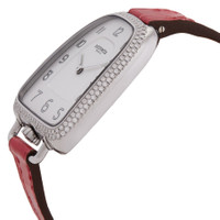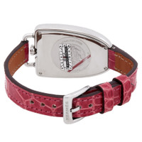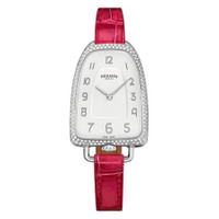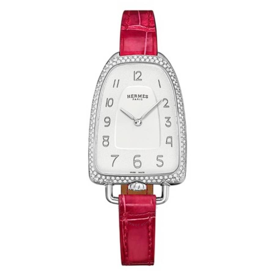 Silver-tone stainless steel case with a raspberry leather strap. Fixed diamond set bezel, 150 diamonds (0.66 ct). Silver dial with silver-tone hands and Arabic numeral hour markers. Dial Type: Analog. Quartz movement. Scratch resistant sapphire crystal. Pull / push crown. Solid case back. Unique case shape, case size: 40.8 mm x 26 mm. Buckle clasp. Water resistant at 30 meters / 100 feet. Functions: hour, minute. Galop Series. Dress watch style. Watch label: Swiss Made. Hermes Galop Quartz Diamond Silver Dial Ladies Watch 047885WW00. GENERAL Box Type: Original Box Brand Type: Designer CASE Case Diameter: 26 Case Material: Stainless Steel Case Shape: Unique Case Back: Solid BAND Band Material: Leather Band Type: Strap Band Color: Raspberry Clasp: Buckle DIAL Dial Color: Silver Type: Analog Crystal: Scratch Resistant Sapphire Hands: Silver-tone Dial Markers: Arabic Numeral Bezel: Fixed Bezel Material: Diamond Set with 150 diamonds (0.66 ct) Crown: Pull / Push INFORMATION Brand: Hermes Series: Galop Collection Name: Galop Gender: Womens Model: 047885WW00 Watch Label: Swiss Made Movement: Quartz FEATURES Water Resistance: 30 meters / 100 feet Functions: Hour, Minute Watch Features: Analog, Leather, Stainless Steel, Diamond ADDITIONAL INFO Watch Style: Dress Warranty: 2 Year Jomashop Warranty Jomashop Sku: HS047885WW00 Department: Watches