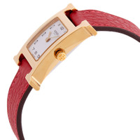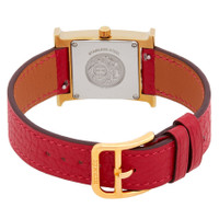 Gold-tone stainless steel case with a red leather strap. Fixed gold-tone stainless steel bezel. White dial with gold-tone hands and Arabic numeral hour markers. Dial Type: Analog. Quartz movement. Scratch resistant sapphire crystal. Pull / push crown. Solid case back. Square case shape. Buckle clasp. Water resistant at 30 meters / 100 feet. Functions: hour, minute. Heure H Series. Casual watch style. Watch label: Swiss Made. Hermes Heure H Quartz White Dial Ladies Watch 040887WW00. GENERAL Box Type: Original Box Brand Type: Designer CASE Case Material: Stainless Steel Case Shape: Square Case Back: Solid BAND Band Material: Leather Band Type: Strap Band Color: Red Clasp: Buckle DIAL Dial Color: White Type: Analog Crystal: Scratch Resistant Sapphire Hands: Gold-tone Dial Markers: Arabic Numeral Bezel: Fixed Bezel Color: Gold-tone Bezel Material: Stainless Steel Crown: Pull / Push INFORMATION Brand: Hermes Series: Heure H Collection Name: Heure H Gender: Womens Model: 040887WW00 Watch Label: Swiss Made Movement: Quartz FEATURES Water Resistance: 30 meters / 100 feet Functions: Hour, Minute Watch Features: Analog, Gold, Leather, Stainless Steel ADDITIONAL INFO Watch Style: Casual Warranty: 2 Year Jomashop Warranty Jomashop Sku: Z-VWYNB Department: Watches