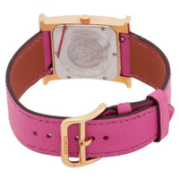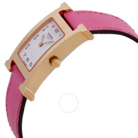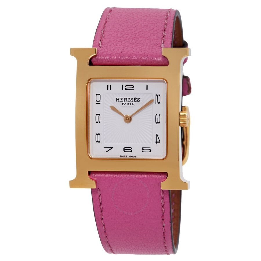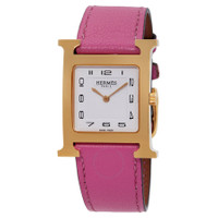 Gold-tone stainless steel case with a pink leather strap. Fixed gold-tone stainless steel bezel. White dial with gold-tone hands and Arabic numeral hour markers. Dial Type: Analog. Quartz movement. Scratch resistant sapphire crystal. Pull / push crown. Solid case back. Square case shape. Buckle clasp. Water resistant at 30 meters / 100 feet. Functions: hour, minute. Heure H Series. Casual watch style. Watch label: Swiss Made. Hermes Heure H Quartz White Dial Ladies Watch 041932WW00. GENERAL Box Type: Original Box Box: No Papers: No Brand Type: Designer CASE Case Material: Stainless Steel Case Shape: Square Case Back: Solid BAND Band Material: Leather Band Type: Strap Band Color: Pink Clasp: Buckle DIAL Dial Color: White Type: Analog Crystal: Scratch Resistant Sapphire Hands: Gold-tone Dial Markers: Arabic Numeral Bezel: Fixed Bezel Color: Gold-tone Bezel Material: Stainless Steel Crown: Pull / Push INFORMATION Brand: Hermes Series: Heure H Collection Name: Heure H Gender: Womens Model: 041932WW00 Watch Label: Swiss Made Movement: Quartz FEATURES Water Resistance: 30 meters / 100 feet Functions: Hour, Minute Watch Features: Analog, Gold, Leather, Stainless Steel ADDITIONAL INFO Watch Style: Casual Warranty: 2 Year Jomashop Warranty Jomashop Sku: HS041932WW00 Department: Watches