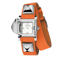Silver-tone stainless steel case with a leather strap. Fixed silver-tone stainless steel bezel. Silver dial with silver-tone hands and index hour markers. Dial Type: Analog. Quartz movement. Scratch resistant sapphire crystal. Pull / push crown. Solid case back. Square case shape, case size: 23 mm. Buckle clasp. Water resistant at 30 meters / 100 feet. Functions: hour, minute. Medor Pm Series. Watch label: Swiss Made. Hermes Medor PM Quartz Silver Dial Ladies Watch 041262WW00. GENERAL Box Type: Original Box Brand Type: Designer CASE Case Size: 23 Case Material: Stainless Steel Case Shape: Square Case Back: Solid BAND Band Material: Leather Band Type: Strap Clasp: Buckle DIAL Dial Color: Silver Type: Analog Crystal: Scratch Resistant Sapphire Hands: Silver-tone Dial Markers: Index Bezel: Fixed Bezel Color: Silver-tone Bezel Material: Stainless Steel Crown: Pull / Push INFORMATION Brand: Hermes Series: Medor Pm Collection Name: Medor PM Gender: Womens Model: 041262WW00 Watch Label: Swiss Made Movement: Quartz FEATURES Water Resistance: 30 meters / 100 feet Functions: Hour, Minute Watch Features: Analog, Leather, Stainless Steel ADDITIONAL INFO Warranty: 2 Year Jomashop Warranty Jomashop Sku: HS041262WW00 Department: Watches