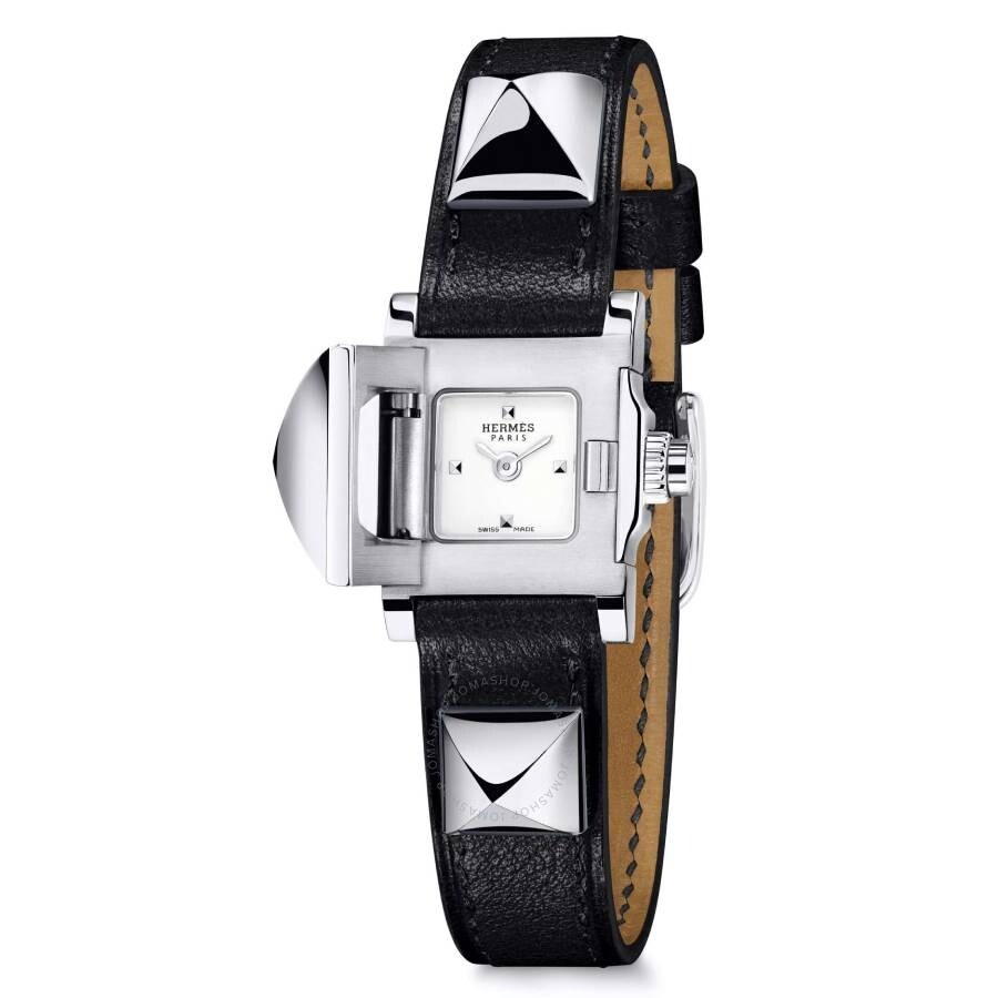 Silver-tone stainless steel case with a black leather strap. Fixed silver-tone stainless steel bezel. Silver dial with silver-tone hands. Dial Type: Analog. Quartz movement. Pull / push crown. Solid case back. Square case shape, case size: 16 x 16 mm. Buckle clasp. Water resistant at 30 meters / 100 feet. Functions: hour, minute. Medor Tpm Series. Watch label: Swiss Made. Hermes Medor TPM Quartz Silver Dial Ladies Watch 028168WW00. GENERAL Box Type: Original Box Brand Type: Designer CASE Case Size: 16 Case Material: Stainless Steel Case Shape: Square Case Back: Solid BAND Band Material: Leather Band Type: Strap Band Color: Black Clasp: Buckle DIAL Dial Color: Silver Type: Analog Hands: Silver-tone Bezel: Fixed Bezel Color: Silver-tone Bezel Material: Stainless Steel Crown: Pull / Push INFORMATION Brand: Hermes Series: Medor Tpm Collection Name: Medor TPM Gender: Womens Model: 028168WW00 Watch Label: Swiss Made Movement: Quartz FEATURES Water Resistance: 30 meters / 100 feet Functions: Hour, Minute Watch Features: Analog, Leather, Stainless Steel ADDITIONAL INFO Warranty: 2 Year Jomashop Warranty Jomashop Sku: HS028168WW00 Department: Watches