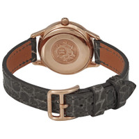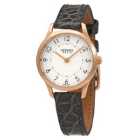 18kt rose gold case with a elephant grey (smooth alligator) leather strap. Fixed 18kt rose gold bezel. Silver dial with rose gold-tone hands and Arabic numeral hour markers. Minute markers around an inner ring. Dial Type: Analog. Quartz movement. Scratch resistant sapphire crystal. Pull / push crown. Solid case back. Round case shape. Case size: 25 mm. Tang clasp. Water resistant at 30 meters / 100 feet. Functions: hour, minute. Slim D Series. Dress watch style. Watch label: Swiss Made. Hermes Slim D Quartz Silver Dial Ladies Watch 041746WW00. INFORMATION Brand: Hermes Series: Slim D Collection Name: Slim D Gender: Womens Model: 041746WW00 Watch Label: CH Switzerland Movement: Quartz CASE Case Size: 25 mm Case Material: 18kt Rose Gold Case Shape: Round Case Back: Solid BAND Band Material: (Smooth Alligator) Leather Band Type: Strap Band Color: Elephant Grey Clasp: Tang DIAL Dial Color: Silver Type: Analog Crystal: Scratch Resistant Sapphire Hands: Rose Gold-tone Dial Markers: Arabic Numeral Second Markers: Minute Markers around an inner ring Bezel: Fixed Bezel Material: 18kt Rose Gold Crown: Pull / Push FEATURES Water Resistance: 30 meters / 100 feet Functions: Hour, Minute Watch Features: Leather, Gold, Analog, Alligator Leather ADDITIONAL INFO Watch Style: Dress Warranty: 2 Year Jomashop Warranty Jomashop Sku: HS041746WW00 Department: Watches Category: Watches