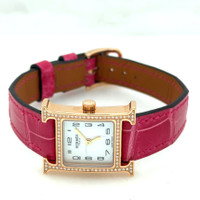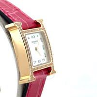 Rose gold-tone 18kt rose gold case with a pink leather strap. Fixed rose gold-tone bezel with diamond set 18kt rose gold. Mother of pearl dial with rose gold-tone hands and Arabic numeral hour markers. Dial Type: Analog. Quartz movement. Scratch resistant sapphire crystal. Pull / push crown. Solid case back. Square case shape, case size: 21 mm, case thickness: 6 mm. Band width: 14 mm. Buckle clasp. Water resistant at 30 meters / 100 feet. Functions: hour, minute. Heure H Series. Luxury watch style. Watch label: Swiss Made. Pre-owned Hermes Heure H Diamond Mother of Pearl Dial Ladies Watch HH1.173. GENERAL Collection Name: Heure H INFORMATION Brand: Hermes Series: Heure H Model: HH1.173 Gender: Womens Watch Label: Swiss Made Movement: Quartz CONDITION INFORMATION Box: Yes Preowned Item Condition: Excellent Papers: Yes Year: 2024 CASE Case Size: 21 Case Thickness: 6 mm Case Material: 18kt Rose Gold Case Shape: Square Case Back: Solid DIAL Type: Analog Dial Color: Mother of Pearl Crystal: Scratch Resistant Sapphire Hands: Rose Gold-tone Dial Markers: Arabic Numeral Bezel: Fixed Bezel Color: Rose Gold-tone Bezel Material: Diamond Set 18kt Rose Gold Crown: Pull / Push BAND Band Type: Strap Band Material: Leather Band Color: Pink Band Width: 14 mm Clasp: Buckle FEATURES Water Resistance: 30 meters / 100 feet Functions: Hour, Minute Watch Features: Analog, Gold, Leather, Diamond ADDITIONAL INFO Watch Style: Luxury Warranty: 1 Year Jomashop Warranty Jomashop Sku: PRE-P-89376 Department: Watches