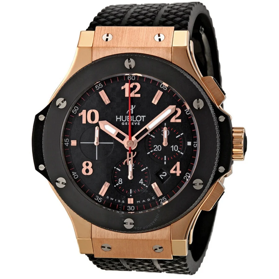18kt rose gold case with a black rubber strap. Fixed black ceramic bezel. Black carbon fiber dial with luminous gold-tone skeleton hands and alternating Arabic numeral and index hour markers. Arabic numeral minute markers (at 5 minute intervals). Minute markers around the outer rim. Dial Type: Analog. Luminescent hands and markers. Date display between 4 and 5 o'clock position. Chronograph - three sub-dials displaying: 60 second, 30 minute and 12 hour. Hublot calibre HUB44 automatic movement, based upon ETA Valjoux 7750, containing 25 Jewels, composed of 252 parts, bitting at 28800 vph, and has a power reserve of approximately 42 hours. Scratch resistant sapphire crystal. Gold and kevlar crown. Skeleton case back. Round case shape. Case size: 44 mm. Case thickness: 14.5 mm. Band width: 24-21 mm. Band length: 8 inches. Deployment clasp. Water resistant at 100 meters / 330 feet. Functions: chronograph, date, hour, minute, second. Dress watch style. Watch label: Swiss Made. Item Variations: 301.PB.131.RX, 301-PB-131-RX, 301/PB/131/RX, 301PB131RX. Hublot Big Bang 18kt Rose Gold Men's Watch 301.PB.131.RX. GENERAL Box Type: Original Box Color: Black / Gold / Rose / Skeleton CASE Case Size: 44 Case Thickness: 14.5 mm Case Material: 18kt Rose Gold Case Shape: Round Case Back: Skeleton BAND Band Material: Rubber Band Type: Strap Band Color: Black Band Length: 8 inches Band Width: 24-21 mm Clasp: Deployment DIAL Dial Color: Black Carbon Fiber Type: Analog Crystal: Scratch Resistant Sapphire Hands: Luminous gold-tone Skeleton Dial Markers: Alternating Arabic Numeral and Index Second Markers: Arabic Numeral Minute markers (at 5 minute intervals). Minute markers around the outer rim Sub Dials: Three - 60 Second, 30 Minute and 12 Hour Luminiscence: Hands and Markers Bezel: Fixed Bezel Color: Black Bezel Material: Ceramic Crown: Gold and Kevlar INFORMATION Brand: Hublot Series: Big Bang Collection Name: Big Bang Gender: Mens Model: 301.PB.131.RX Watch Label: Swiss Made Movement: Automatic Engine: Hublot Calibre HUB44 Power Reserve: 42 hours FEATURES Water Resistance: 100 meters / 330 feet Calendar: Date display between the 4 and 5 o'clock positions Functions: Chronograph, Date, Hour, Minute, Second Watch Features: Analog, Ceramic, Gold, Rubber, Chronograph ADDITIONAL INFO Watch Style: Dress Warranty: 2 Year Jomashop Warranty Jomashop Sku: HB301PB131RX Item Variation: 301.PB.131.RX, 301-PB-131-RX, 301/PB/131/RX, 301PB131RX Department: Watches Category: Watches