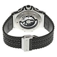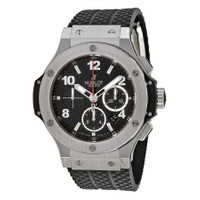 Stainless steel case with lateral black Kevlar inserts and a black rubber strap. Fixed stainless steel bezel. Black dial with lumious silver-tone skeleton hands and alternating Arabic numeral and index hour markers. Minute markers around outter rim. Dial Type: Analog. Luminescent hands and markers. Date display between the 4 and 5 o'clock positions. Chronograph - three sub-dials displaying: 12 hours, 30 minutes, small seconds. Hublot calibre HUB4100 automatic movement, based upon ETA 2894-2, containing 27 Jewels, composed of 252 parts, bitting at 28800 vph, and has a power reserve of approximately 42 hours. Scratch resistant sapphire crystal. Pull / push crown. Transparent case back. Round case shape. Case size: 44 mm. Case thickness: 14.5 mm. Band width: 25 mm. Band length: 8.5 inches. Deployment clasp. Water resistant at 100 meters / 330 feet. Functions: chronograph, date, hour, minute, second. Dress watch style. Watch label: Swiss Made. Item Variations: 301.SX.130.RX, 301-SX-130-RX, 301/SX/130/RX, 301SX130RX. Hublot Big Bang Automatic 44mm Men's Watch 301.SX.130.RX. GENERAL Box Type: Original Box Color: Black CASE Case Size: 44 Case Thickness: 14.5 mm Case Material: Stainless Steel Case Shape: Round Case Back: Transparent BAND Band Material: Rubber Band Type: Strap Band Color: Black Band Length: 8.5 inches Band Width: 25 mm Clasp: Deployment DIAL Dial Color: Black Type: Analog Crystal: Scratch Resistant Sapphire Hands: Lumious Silver-tone Skeleton Dial Markers: Arabic Numeral and Index Second Markers: Minute markers around outter rim Sub Dials: Three - 12 Hour, 30 Minute and Small Second Luminiscence: Hands and Markers Bezel: Fixed Bezel Color: Silver-tone Bezel Material: Stainless Steel Crown: Pull / Push INFORMATION Brand: Hublot Series: Big Bang Collection Name: Big Bang Gender: Mens Model: 301.SX.130.RX Watch Label: Swiss Made Movement: Automatic Engine: Hublot Calibre HUB4100 Power Reserve: 42 hours FEATURES Water Resistance: 100 meters / 330 feet Calendar: Date display between 4 and 5 o'clock position Functions: Chronograph, Date, Hour, Minute, Second Watch Features: Analog, Rubber, Stainless Steel, Chronograph ADDITIONAL INFO Watch Style: Dress Warranty: 2 Year Jomashop Warranty UPC Code: 0845858078432 Jomashop Sku: HB301SX130RX Item Variation: 301.SX.130.RX, 301-SX-130-RX, 301/SX/130/RX, 301SX130RX Department: Watches Category: Watches