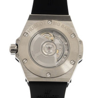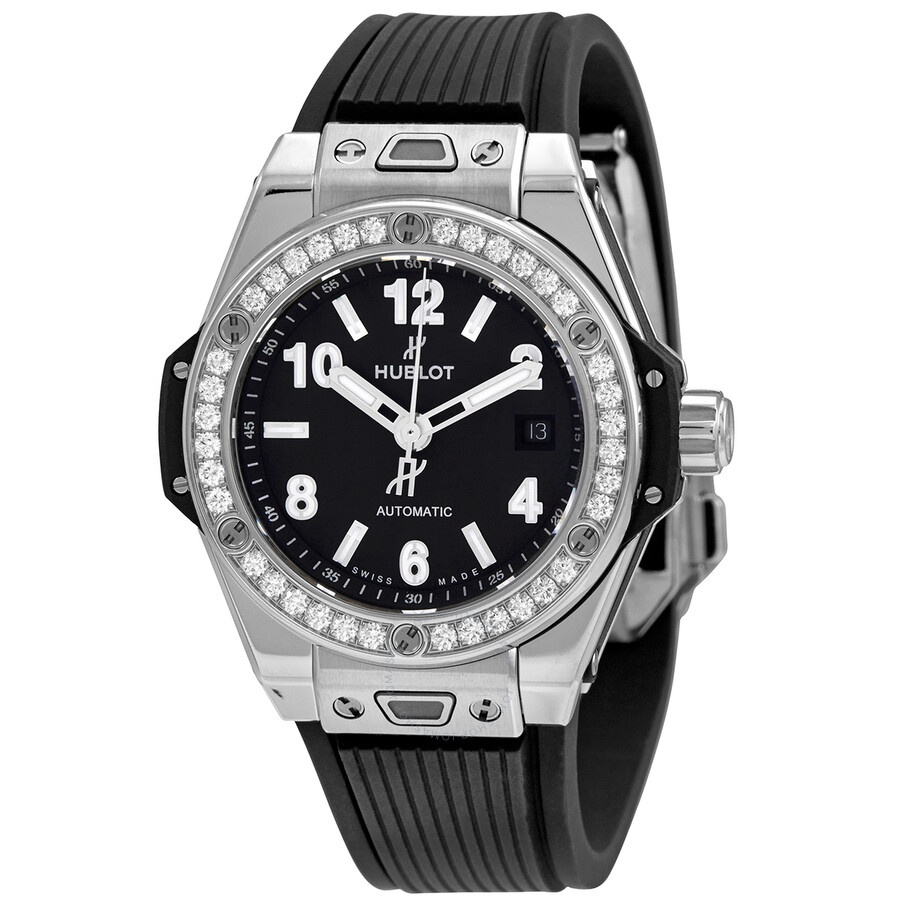 Stainless steel case with a black rubber strap. Fixed stainless steel bezel set with 36 diamonds. Black dial with luminous silver-tone hands and alternating Arabic numeral and index hour markers. Arabic numeral minute markers (at 5 minute intervals). Minute markers around the outer rim. Dial Type: Analog. Luminescent hands and markers. Date display at the 3 o'clock position. Hublot calibre HUB1120 automatic movement, containing 18 Jewels, composed of 65 parts, bitting at 28800 vph, and has a power reserve of approximately 40 hours. Scratch resistant sapphire crystal. Transparent case back. Round case shape. Case size: 33 mm. Deployment clasp with a push button release. Water resistant at 100 meters / 330 feet. Functions: date, hour, minute, second. Additional Info: original box, manual (complete accessories). Big Bang Series. Luxury watch style. Watch label: Swiss Made. Hublot Big Bang Automatic Diamond Black Dial Ladies Watch 485.SX.1170.RX.1204. INFORMATION Brand: Hublot Series: Big Bang Collection Name: Big Bang Gender: Womens Model: 485.SX.1170.RX.1204 Watch Label: Swiss Made Movement: Automatic Engine: Hublot Calibre HUB1120 Power Reserve: 40 hours CASE Case Size: 33 mm Case Material: Stainless Steel Case Shape: Round Case Back: Transparent BAND Band Material: Rubber Band Type: Strap Band Color: Black Clasp: Deployment with Push Button Release DIAL Dial Color: Black Type: Analog Crystal: Scratch Resistant Sapphire Hands: Luminous Silver-tone Dial Markers: Alternating Arabic Numeral and Index Second Markers: Arabic Numeral Minute Markers (at 5 minute intervals). Minute Markers around the outer rim Luminiscence: Hands and Markers Bezel: Fixed Bezel Color: Silver-tone Bezel Material: Stainless Steel set with 36 Diamonds FEATURES Water Resistance: 100 meters / 330 feet Calendar: Date display at the 3 o'clock position Functions: Date, Hour, Minute, Second Watch Features: Diamond, Stainless Steel, Rubber, Analog ADDITIONAL INFO Watch Style: Luxury Warranty: 2 Year Jomashop Warranty Additional Info: Original Box, Manual (Complete Accessories) Jomashop Sku: HB485SX1170RX1204 Department: Watches Category: Watches