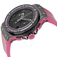 Black ceramic case with a pink leather strap and pink rubber strap. Fixed black PVD coated white 18kt gold bezel with 48 baguette cut pink sapphires mineral stones. Black dial with silver skeleton hands and alternating index and Arabic numeral hour markers. Minute markers around the outer rim. Dial Type: Analog. Date display between 4 and 5 o'clock position. Chronograph - three sub-dials displaying: small running seconds, 30 minute and 12 hour. Hublot Calibre HUB4300 Automatic movement, based upon ETA 2894, containing 37 Jewels, composed of 278 parts, bitting at 28800 vph, and has a power reserve of approximately 42 hours. Scratch resistant sapphire crystal. Pull / push crown. Transparent case back. Case diameter: 41 mm. Case thickness: 14 mm. Round case shape. Fold over clasp with push button release. Water resistant at 30 meters / 100 feet. Functions: chronograph, date, hour, minute, second, stopwatch. 18kt white gold set with 48 pink stones. Luxury watch style. Watch label: Swiss Made. Hublot Big Bang Black Dial Chronograph Ladies Watch 341.CP.1110.LR.1933. INFORMATION Brand: Hublot Series: Big Bang Tutti Frutti Collection Name: Big Bang Tutti Frutti Gender: Womens Model: 341.CP.1110.LR.1933 Watch Label: Swiss Made Movement: Automatic Engine: Hublot Calibre HUB4300 Power Reserve: 42 hours CASE Case Size: 41 mm Case Thickness: 14 mm Case Material: Ceramic Case Shape: Round Case Back: Transparent BAND Band Material: Leather and Rubber Band Type: Strap Band Color: Pink Clasp: Fold Over with Push Button Release DIAL Dial Color: Black Type: Analog Crystal: Scratch Resistant Sapphire Hands: Silver Skeleton Dial Markers: Alternating Index and Arabic Numeral Second Markers: Minute Markers around the outer rim Sub Dials: Three - Small Running Second, 30 Minute and 12 Hour Bezel: Fixed Bezel Color: 18kt White Gold Bezel Material: 48 Baguette cut Pink Sapphires Crown: Pull / Push FEATURES Water Resistance: 30 meters / 100 feet Calendar: Date display between 4 and 5 o'clock position Functions: Chronograph, Date, Hour, Minute, Second Watch Features: Analog, Ceramic, Gold, Leather, Rubber, Chronograph ADDITIONAL INFO Watch Style: Luxury Warranty: 2 Year Jomashop Warranty Additional Info: Bezel: Black PVD coated 18Kt White Gold Set with 48 Pink Stones Jomashop Sku: HB341CP1110LR1933 Item Variation: 341 CP 1110 LR 1933, 341-CP-1110-LR-1933, 341/CP/1110/LR/1933, 341CP1110LR1933 Department: Watches Category: Watches