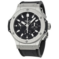 Silver-tone stainless steel case with a black (alligator) leather (rubber backed) strap. Fixed silver-tone stainless steel bezel. Black dial with luminous silver-tone skeleton hands and index hour markers. Minute markers around the outer rim. Dial Type: Analog. Luminescent hands and markers. Date display between the 4 and 5 o'clock positions. Chronograph - three sub-dials displaying: 60 second, 30 minute and 12 hour. Hublot Calibre HUB4100 Automatic movement, based upon ETA 2894-2, containing 27 Jewels, composed of 252 parts, bitting at 28800 vph, and has a power reserve of approximately 42 hours. Scratch resistant sapphire crystal. Pull / push crown. Transparent case back. Round case shape, case size: 45 mm, case thickness: 14.5 mm. Band width: 22.9 mm, band length: 9 inches. Fold over with push button release clasp. Water resistant at 100 meters / 330 feet. Functions: chronograph, date, hour, minute, second. Luxury watch style. Watch label: Swiss Made. Item Variations: 301 SX 1170 GR, 301-SX-1170-GR, 301/SX/1170/GR, 301SX1170GR. Hublot Big Bang Chronograph Automatic Black Dial Men's Watch 301SX1170GR. GENERAL Box Type: Original Box CASE Case Size: 45 Case Thickness: 14.5 mm Case Material: Stainless Steel Case Shape: Round Case Back: Transparent BAND Band Material: (Alligator) Leather (Rubber Backed) Band Type: Strap Band Color: Black Band Length: 9 inches Band Width: 22.9 mm Clasp: Fold Over with Push Button Release DIAL Dial Color: Black Type: Analog Crystal: Scratch Resistant Sapphire Hands: Luminous Silver-tone Skeleton Dial Markers: Index Second Markers: Minute Markers around the outer rim Sub Dials: Three - 60 Second, 30 Minute and 12 Hour Luminiscence: Hands and Markers Bezel: Fixed Bezel Color: Silver-tone Bezel Material: Stainless Steel Crown: Pull / Push INFORMATION Brand: Hublot Series: Big Bang Collection Name: Big Bang Gender: Mens Model: 301.SX.1170.GR Watch Label: Swiss Made Movement: Automatic Engine: Hublot Calibre HUB4100 Power Reserve: 42 hours FEATURES Water Resistance: 100 meters / 330 feet Calendar: Date display between the 4 and 5 o'clock positions Functions: Chronograph, Date, Hour, Minute, Second Watch Features: Alligator Leather, Analog, Leather, Rubber, Stainless Steel, Chronograph ADDITIONAL INFO Watch Style: Luxury Warranty: 2 Year Jomashop Warranty UPC Code: 845960063272 Jomashop Sku: HB301SX1170GR Item Variation: 301 SX 1170 GR, 301-SX-1170-GR, 301/SX/1170/GR, 301SX1170GR Department: Watches Category: Watches