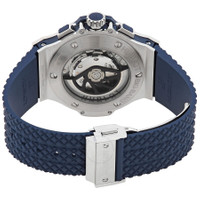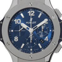 Stainless steel case with a blue rubber strap. Fixed stainless steel bezel. Blue dial with luminous silver-tone skeleton hands and index-Arabic numeral hour markers. Arabic numeral minute markers (at 5 minute intervals). Dial Type: Analog. Luminescent hands and markers. Date display between 4 and 5 o'clock position. Chronograph - three sub-dials displaying: 60 second, 30 minute and 12 hour. Hublot calibre HUB4100 automatic movement, based upon ETA 2894-2, containing 27 Jewels, composed of 252 parts, bitting at 28800 vph, and has a power reserve of approximately 42 hours. Scratch resistant sapphire crystal. Pull / push crown. Transparent case back. Round case shape. Case size: 44 mm. Case thickness: 14.5 mm. Fold over clasp. Water resistant at 100 meters / 330 feet. Functions: chronograph, date, hour, minute, second. Big Bang Series. Luxury watch style. Watch label: Swiss Made. Hublot Big Bang Chronograph Automatic Blue Dial Men's Watch 301.SX.710.RX. INFORMATION Brand: Hublot Series: Big Bang Collection Name: Big Bang Gender: Mens Model: 301.SX.710.RX Watch Label: Swiss Made Movement: Automatic Engine: Hublot Calibre HUB4100 Power Reserve: 42 hours CASE Case Size: 44 mm Case Thickness: 14.5 mm Case Material: Stainless Steel Case Shape: Round Case Back: Transparent BAND Band Material: Rubber Band Type: Strap Band Color: Blue Clasp: Fold Over DIAL Dial Color: Blue Type: Analog Crystal: Scratch Resistant Sapphire Hands: Luminous Silver-tone Skeleton Dial Markers: Index-Arabic Numeral Second Markers: Arabic Numeral Minute Markers (at 5 minute intervals) Sub Dials: Three - 60 Second, 30 Minute and 12 Hour Luminiscence: Hands and Markers Bezel: Fixed Bezel Color: Silver-tone Bezel Material: Stainless Steel Crown: Pull / Push FEATURES Water Resistance: 100 meters / 330 feet Calendar: Date display between 4 and 5 o'clock position Functions: Chronograph, Date, Hour, Minute, Second Watch Features: Chronograph, Stainless Steel, Rubber, Analog ADDITIONAL INFO Watch Style: Luxury Warranty: 2 Year Jomashop Warranty Jomashop Sku: HB301SX710RX Department: Watches Category: Watches