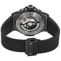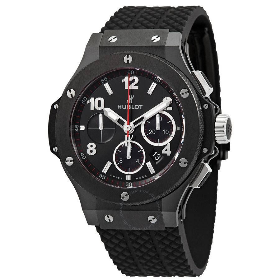 Black ceramic case with a black rubber strap. Fixed black ceramic bezel. Carbon fiber dial with luminous silver-tone skeleton hands and alternating index and Arabic numeral hour markers. Arabic numeral minute markers (at 5 minute intervals). Minute markers around the outer rim. Dial Type: Analog. Luminescent hands and markers. Date display between the 4 and 5 o'clock positions. Chronograph - three sub-dials displaying: 60 second, 30 minute and 12 hour. Hublot calibre HUB4100 automatic movement, based upon ETA 2894-2, containing 27 Jewels, composed of 252 parts, bitting at 28800 vph, and has a power reserve of approximately 42 hours. Scratch resistant sapphire crystal. Pull / push crown. Transparent case back. Round case shape. Case size: 44 mm. Case thickness: 14.5 mm. Deployant clasp. Water resistant at 100 meters / 330 feet. Functions: chronograph, date, hour, minute, second. Big Bang Series. Luxury watch style. Watch label: Swiss Made. Hublot Big Bang Chronograph Automatic Carbon Fiber Dial Men's Watch 301.CM.130.RX. INFORMATION Brand: Hublot Series: Big Bang Collection Name: Big Bang Gender: Mens Model: 301.CM.130.RX Watch Label: Swiss Made Movement: Automatic Engine: Hublot Calibre HUB4100 Power Reserve: 42 hours CASE Case Size: 44 mm Case Thickness: 14.5 mm Case Material: Ceramic Case Shape: Round Case Back: Transparent BAND Band Material: Rubber Band Type: Strap Band Color: Black Clasp: Deployant DIAL Dial Color: Carbon Fiber Type: Analog Crystal: Scratch Resistant Sapphire Hands: Luminous Silver-tone Skeleton Dial Markers: Alternating Index and Arabic Numeral Second Markers: Arabic Numeral Minute Markers (at 5 minute intervals). Minute Markers around the outer rim Sub Dials: Three - 60 Second, 30 Minute and 12 Hour Luminiscence: Hands and Markers Bezel: Fixed Bezel Color: Black Bezel Material: Ceramic Crown: Pull / Push FEATURES Water Resistance: 100 meters / 330 feet Calendar: Date display between 4 and 5 o'clock position Functions: Chronograph, Date, Hour, Minute, Second Watch Features: Chronograph, Rubber, Ceramic, Analog ADDITIONAL INFO Watch Style: Luxury Warranty: 2 Year Jomashop Warranty Jomashop Sku: HB301CM130RX Department: Watches Category: Watches