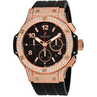 18kt rose gold case (set with 212 diamonds) with a black rubber strap. Fixed 18kt rose gold bezel set with 114 diamonds (1.78 carats). Black dial with luminous rose gold-tone hands and alternating Arabic numeral and index hour markers. Minute markers around the outer rim. Dial Type: Analog. Luminescent hands and markers. Date display between the 4 and 5 o'clock positions. Chronograph - three sub-dials displaying: 60 second, 30 minute and 12 hour. Hublot calibre HUB44 automatic movement with a 42-hour power reserve. Scratch resistant sapphire crystal. Pull / push crown. Transparent case back. Round case shape. Case size: 44 mm. Case thickness: 14.5 mm. Band width: 24 mm. Band length: 8 inches. Deployment clasp. Water resistant at 100 meters / 330 feet. Functions: chronograph, date, hour, minute, second. Luxury watch style. Watch label: Swiss Made. Item Variations: 301.PX.130.RX.174, 301-PX-130-RX-174, 301/PX/130/RX/174, 301PX130RX174. Hublot Big Bang Chronograph Automatic Diamond Black Dial Men's Watch 301.PX.130.RX.174. GENERAL Color: Black / Gold / Rose CASE Case Size: 44 Case Thickness: 14.5 mm Case Material: 18kt Rose Gold set with 212 Diamonds Case Shape: Round Case Back: Transparent BAND Band Material: Rubber Band Type: Strap Band Color: Black Band Length: 8 Inches Band Width: 24 mm Clasp: Deployment DIAL Dial Color: Black Type: Analog Crystal: Scratch Resistant Sapphire Hands: Luminous Rose Gold-tone Dial Markers: Alternating Arabic Numeral and Index Second Markers: Minute Markers around the outer rim Sub Dials: Three - 60 Second, 30 Minute and 12 Hour Luminiscence: Hands and Markers Bezel: Fixed Bezel Material: 18kt Rose Gold with 114 diamonds (1.78 carats) Crown: Pull / Push INFORMATION Brand: Hublot Series: Big Bang Collection Name: Big Bang Gender: Mens Model: 301.PX.130.RX.174 Watch Label: Swiss Made Movement: Automatic Engine: Hublot Calibre HUB44 Power Reserve: 42 hours FEATURES Water Resistance: 100 meters / 330 feet Calendar: Date display between the 4 and 5 o'clock positions Functions: Chronograph, Date, Hour, Minute, Second Watch Features: Gold, Rubber, Chronograph, Diamond ADDITIONAL INFO Watch Style: Luxury Warranty: 2 Year Jomashop Warranty Jomashop Sku: HB301PX130RX174 Item Variation: 301.PX.130.RX.174, 301-PX-130-RX-174, 301/PX/130/RX/174, 301PX130RX174 Department: Watches Category: Watches