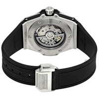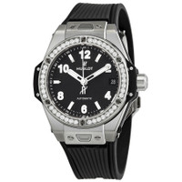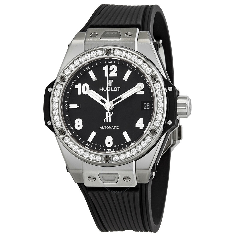 Silver-tone stainless steel with lateral black inserts case with a black lined rubber strap. Fixed silver-tone stainless steel set with 42 diamonds bezel. Black dial with luminous silver-tone hands and alternating Arabic numeral and index hour markers. Minute markers around the outer rim. Dial Type: Analog. Luminescent hands and markers. Date display at the 3 o'clock position. Hublot Calibre HUB1710 Automatic movement, based upon Zenith Elite 670, containing 27 Jewels, bitting at 28800 vph, and has a power reserve of approximately 50 hours. Scratch resistant sapphire crystal. Pull / push crown. Transparent case back. Round case shape, case size: 39 mm. Fold over clasp with a push button release. Water resistant at 100 meters / 330 feet. Functions: chronograph, date, hour, minute, second. Additional Info: 36 brilliant cut diamonds (about 1.31 carats). Big Bang One Click Series. Luxury watch style. Watch label: Swiss Made. Hublot Big Bang Chronograph Automatic Diamond Black Dial Men's Watch 465.SX.1170.RX.1204. INFORMATION Brand: Hublot Series: Big Bang One Click Collection Name: Big Bang One Click Gender: Mens Model: 465.SX.1170.RX.1204 Watch Label: Swiss Made Movement: Automatic Engine: Hublot Calibre HUB1710 Power Reserve: 50 Hour CASE Case Size: 39 mm Case Material: Stainless Steel with Lateral Black Inserts Case Shape: Round Case Back: Transparent BAND Band Material: Lined Rubber Band Type: Strap Band Color: Black Clasp: Fold Over with Push Button Release DIAL Dial Color: Black Type: Analog Crystal: Scratch Resistant Sapphire Hands: Luminous Silver-tone Dial Markers: Alternating Arabic Numeral and Index Second Markers: Minute Markers around the outer rim Luminiscence: Hands and Markers Bezel: Fixed Bezel Color: Silver-tone Bezel Material: Stainless Steel set with 42 Diamonds Crown: Pull / Push FEATURES Water Resistance: 100 meters / 330 feet Calendar: Date display at the 3 o'clock position Functions: Chronograph, Date, Hour, Minute, Second Watch Features: Diamond, Chronograph, Stainless Steel, Rubber, Analog ADDITIONAL INFO Watch Style: Luxury Warranty: 2 Year Jomashop Warranty UPC Code: 078000163797 Additional Info: 36 brilliant cut diamonds (about 1.31 carats) Jomashop Sku: HB465SX1170RX1204 Department: Watches Category: Watches