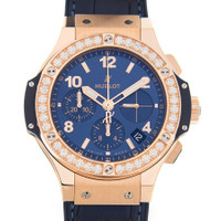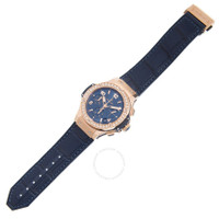 Gold-tone 18kt rose gold case with a blue leather/rubber strap. Fixed 18kt rose gold bezel with diamond set. Blue dial with gold-tone hands and diamond hour markers. Minute markers around the outer rim. Dial Type: Analog. Date display between 4 and 5 o'clock position. Chronograph - three sub-dials displaying: 60 second, 30 minute and 12 hour. Hublot Calibre HUB4300 Automatic movement, based upon ETA 2894, containing 37 Jewels, composed of 278 parts, bitting at 28800 vph, and has a power reserve of approximately 42 hours. Scratch resistant sapphire crystal. Screw down crown. Transparent case back. Round case shape, case size: 41 mm. Deployment clasp. Water resistant at 100 meters / 330 feet. Functions: chronograph, date, hour, minute, second. Big Bang Series. Luxury watch style. Watch label: Swiss Made. Hublot Big Bang Chronograph Automatic Diamond Blue Dial Men's Watch 341.PX.7180.LR.1204. GENERAL Box Type: Original Box CASE Case Size: 41 Case Material: 18kt Rose Gold Case Shape: Round Case Back: Transparent BAND Band Material: Leather/Rubber Band Type: Strap Band Color: Blue Clasp: Deployment DIAL Dial Color: Blue Type: Analog Crystal: Scratch Resistant Sapphire Hands: Gold-tone Dial Markers: Diamond Second Markers: Minute Markers around the outer rim Sub Dials: Three - 60 Second, 30 Minute and 12 Hour Bezel: Fixed Bezel Color: 18kt Rose Gold Bezel Material: Diamond Set Crown: Screw Down INFORMATION Brand: Hublot Series: Big Bang Collection Name: Big Bang Gender: Mens Model: 341.PX.7180.LR.1204 Watch Label: Swiss Made Movement: Automatic Engine: Hublot Calibre HUB4300 Power Reserve: 42 hours FEATURES Water Resistance: 100 meters / 330 feet Calendar: Date display between 4 and 5 o'clock position Functions: Chronograph, Date, Hour, Minute, Second Watch Features: Analog, Gold, Leather, Rubber, Chronograph, Diamond ADDITIONAL INFO Watch Style: Luxury Warranty: 2 Year Jomashop Warranty Jomashop Sku: HB341PX7180LR1204 Department: Watches Category: Watches
