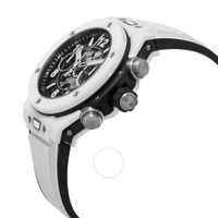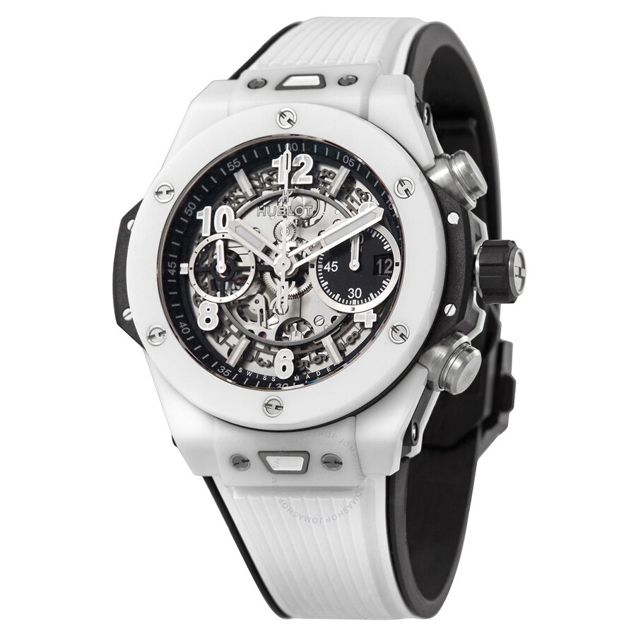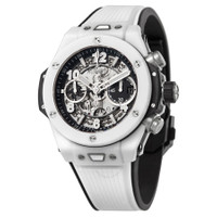 White ceramic case with a white rubber strap. Fixed white ceramic bezel. Transparent dial with luminous silver-tone hands and alternating index and Arabic numeral hour markers. Arabic numeral minute markers (at 5 minute intervals). Minute markers around the outer rim. Dial Type: Analog. Luminescent hands and markers. Date display at the 3 o'clock position. Chronograph - two sub-dials displaying: 60 minute and 60 second. Hublot Calibre HUB1280 Automatic movement, containing 43 Jewels, composed of 354 parts, bitting at 28800 vph, and has a power reserve of approximately 72 hours. Scratch resistant sapphire crystal. Screw down crown. Transparent case back. Round case shape, case size: 42 mm. Deployment clasp. Water resistant at 100 meters / 330 feet. Functions: chronograph, column wheel, hour, minute, second. Additional Info: original box, manual (complete accessories). Big Bang Series. Luxury watch style. Watch label: Swiss Made. Hublot Big Bang Chronograph Automatic Men's Watch 441.HX.1171.RX. INFORMATION Brand: Hublot Series: Big Bang Collection Name: Big Bang Gender: Mens Model: 441.HX.1171.RX Watch Label: Swiss Made Movement: Automatic Engine: Hublot Calibre HUB1280 Power Reserve: 72 hours CASE Case Size: 42 mm Case Material: Ceramic Case Shape: Round Case Back: Transparent BAND Band Material: Rubber Band Type: Strap Band Color: White Clasp: Deployment DIAL Dial Color: Transparent Type: Analog Crystal: Scratch Resistant Sapphire Hands: Luminous Silver-tone Dial Markers: Alternating Index and Arabic Numeral Second Markers: Arabic Numeral Minute Markers (at 5 minute intervals). Minute Markers around the outer rim Sub Dials: Two - 60 Minute and 60 Second Luminiscence: Hands and Markers Bezel: Fixed Bezel Color: White Bezel Material: Ceramic Crown: Screw Down FEATURES Water Resistance: 100 meters / 330 feet Calendar: Date display at the 3 o'clock position Functions: Chronograph, Column Wheel, Hour, Minute, Second Watch Features: Chronograph, Rubber, Ceramic, Analog ADDITIONAL INFO Watch Style: Luxury Warranty: 2 Year Jomashop Warranty Additional Info: Original Box, Manual (Complete Accessories) Jomashop Sku: HB441HX1171RX Department: Watches Category: Watches