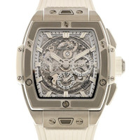 Grey titanium case with a white rubber strap. Fixed grey titanium bezel. Transparent dial with silver-tone hands and index hour markers. Minute markers around the outer rim. Dial Type: Analog. Luminescent hands and markers. Date display between 4 and 5 o'clock position. Chronograph - three sub-dials displaying: 60 second, 30 minute and 12 hour. Automatic movement. Scratch resistant sapphire crystal. Transparent see through case back. Tonneau case shape, case size: 39 mm. Deployment with push button release clasp. Water resistant at 100 meters / 330 feet. Functions: chronograph, date, hour, minute, second. Additional Info: original box, international warranty card, manual (complete accessories). Big Bang Series. Luxury watch style. Watch label: Swiss Made. Hublot Big Bang Chronograph Automatic Men's Watch 642.NE.2010.RW. INFORMATION Brand: Hublot Series: Big Bang Collection Name: Big Bang Gender: Mens Model: 642.NE.2010.RW Watch Label: Swiss Made Movement: Automatic CASE Case Size: 39 mm Case Material: Titanium Case Shape: Tonneau Case Back: Transparent See Through BAND Band Material: Rubber Band Type: Strap Band Color: White Clasp: Deployment with Push Button Release DIAL Dial Color: Transparent Type: Analog Crystal: Scratch Resistant Sapphire Hands: Silver-tone Dial Markers: Index Second Markers: Minute Markers around the outer rim Sub Dials: Three - 60 Second, 30 Minute and 12 Hour Luminiscence: Hands and Markers Bezel: Fixed Bezel Color: Grey Bezel Material: Titanium FEATURES Water Resistance: 100 meters / 330 feet Calendar: Date display between 4 and 5 o'clock position Functions: Chronograph, Date, Hour, Minute, Second Watch Features: Chronograph, Titanium, Rubber, Analog ADDITIONAL INFO Watch Style: Luxury Warranty: 2 Year Jomashop Warranty Additional Info: Original Box, International Warranty Card, Manual (Complete Accessories) Jomashop Sku: HB642NE2010RW Department: Watches Category: Watches