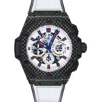 Black carbon fiber case with a white leather strap. Fixed black carbon fiber and resin bezel. Skeleton dial with blue hands and index hour markers. Minute markers around the outer rim. Dial Type: Analog. Luminescent hands and markers. Date display between 4 and 5 o'clock position. Chronograph - three sub-dials displaying: 60 second, 30 minute and 12 hour. Automatic movement. Hub 1240 engine. Scratch resistant sapphire crystal. Case diameter: 48 mm. Round case shape. Deployment clasp. Water resistant at 100 meters / 330 feet. Functions: chronograph, date, hour, minute, second. Luxury watch style. Watch label: Swiss Made. Hublot Big Bang Chronograph Skeleton Dial Leather Men's Watch 710.QX.2139.GR.LDB1. GENERAL Box Type: Original Box CASE Case Size: 48 Case Material: Carbon Fiber Case Shape: Round BAND Band Material: Leather Band Type: Strap Band Color: White Clasp: Deployment DIAL Dial Color: Skeleton Type: Analog Crystal: Scratch Resistant Sapphire Hands: Blue Dial Markers: Index Second Markers: Minute Markers around the outer rim Sub Dials: Three - 60 Second, 30 Minute and 12 Hour Luminiscence: Hands and Markers Bezel: Fixed Black Carbon Fiber and Resin INFORMATION Brand: Hublot Series: Big Bang Collection Name: Big Bang Gender: Mens Model: 710.QX.2139.GR.LDB1 Watch Label: Swiss Made Movement: Automatic Engine: Hublot Calibre HUB1240 Power Reserve: 72 hours FEATURES Water Resistance: 100 meters / 330 feet Calendar: Date display between 4 and 5 o'clock position Functions: Chronograph, Date, Hour, Minute, Second Watch Features: Analog, Leather, Chronograph ADDITIONAL INFO Watch Style: Luxury Warranty: 2 Year Jomashop Warranty Jomashop Sku: HB710QX2139GRLDB1 Item Variation: 710 QX 2139 GR LDB1, 710-QX-2139-GR-LDB1, 710/QX/2139/GR/LDB1, 710QX2139GRLDB1 Department: Watches Category: Watches