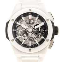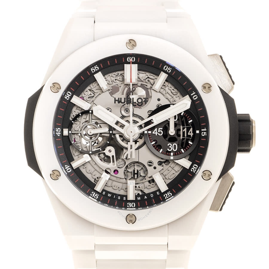 White ceramic case with a white ceramic bracelet. Fixed white ceramic bezel. Mat grey (skeleton center) dial with luminous silver-tone hands and index hour markers. Arabic numeral minute markers (at 5 minute intervals). Minute markers around the outer rim. Dial Type: Analog. Luminescent hands and markers. Date display between 4 and 5 o'clock position. Chronograph - two sub-dials displaying: 60 minute and 60 second. Hublot calibre HUB1280 automatic movement, containing 43 Jewels, composed of 354 parts, bitting at 28800 vph, and has a power reserve of approximately 72 hours. Scratch resistant sapphire crystal. Screw down crown. Transparent case back. Round case shape. Case size: 42 mm, case thickness: 14.5 mm. Deployment clasp. Water resistant at 100 meters / 330 feet. Functions: chronograph, date, hour, minute, second. Big Bang Integral Series. Luxury watch style. Watch label: Swiss Made. Hublot Big Bang Integral Chronograph Automatic Men's Watch 451.hx.1123.hx. GENERAL Box Type: Original Box CASE Case Size: 42 Case Thickness: 14.5 mm Case Material: Ceramic Case Shape: Round Case Back: Transparent BAND Band Material: Ceramic 1 Band Type: Bracelet Band Color: White Clasp: Deployment DIAL Dial Color: Mat Grey (Skeleton Center) Type: Analog Crystal: Scratch Resistant Sapphire Hands: Luminous Silver-tone Dial Markers: Index Second Markers: Arabic Numeral Minute Markers (at 5 minute intervals). Minute Markers around the outer rim Sub Dials: Two - 60 Minute and 60 Second Luminiscence: Hands and Markers Bezel: Fixed Bezel Color: White Bezel Material: Ceramic Crown: Screw Down INFORMATION Brand: Hublot Series: Big Bang Collection Name: Big Bang Integral Gender: Mens Model: 451.hx.1123.hx Watch Label: Swiss Made Movement: Automatic Engine: Hublot Calibre HUB1280 Power Reserve: 72 hours FEATURES Water Resistance: 100 meters / 330 feet Calendar: Date display between 4 and 5 o'clock position Functions: Chronograph, Date, Hour, Minute, Second Watch Features: Analog, Ceramic, Chronograph ADDITIONAL INFO Watch Style: Luxury Warranty: 2 Year Jomashop Warranty Jomashop Sku: HB451HX1123HX Department: Watches Category: Watches