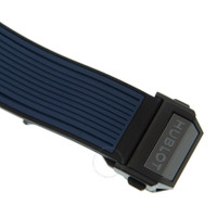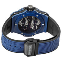Blue ceramic case with a blue rubber strap. Case center (edge) lateral black composite resin inserts. Fixed blue ceramic bezel. Matte blue skeleton dial with luminous silver-tone hands and index hour markers. Arabic numeral minute markers (at 5 minute intervals). Minute markers around the outer rim. Dial Type: Analog. Luminescent hands and markers. Small seconds sub-dial. Power reserve indicator. Hublot calibre HUB1201 hand wind movement, containing 24 Jewels, composed of 233 parts, bitting at 21600 vph, and has a power reserve of approximately 240 hours. Scratch resistant sapphire crystal. Screw down crown. Transparent case back. Round case shape. Case size: 45 mm. Case thickness: 15.95 mm. Deployment clasp. Water resistant at 100 meters / 330 feet. Functions: hour, minute, second, power reserve. Additional Info: limited edition of 500 pieces. Big Bang Meca-10 Series. Luxury watch style. Watch label: Swiss Made. Hublot Big Bang Meca-10 Hand Wind Men's Watch 414.EX.5123.RX. GENERAL Box Type: Original Box CASE Case Size: 45 Case Thickness: 15.95 mm Case Material: Ceramic Case Shape: Round Case Back: Transparent BAND Band Material: Rubber Band Type: Strap Band Color: Blue Clasp: Deployment DIAL Dial Color: Matte Blue Skeleton Type: Analog Crystal: Scratch Resistant Sapphire Hands: Luminous Silver-tone Dial Markers: Index Second Markers: Arabic Numeral Minute markers (at 5 minute intervals). Minute Markers around the outer rim Sub Dials: Two - Small Second and Power Reserve Indicator Luminiscence: Hands and Markers Bezel: Fixed Bezel Color: Blue Bezel Material: Ceramic Crown: Screw Down INFORMATION Brand: Hublot Series: Big Bang Collection Name: Big Bang Meca-10 Gender: Mens Model: 414.EX.5123.RX Watch Label: Swiss Made Movement: Hand Wind Engine: Hublot Calibre HUB1201 Power Reserve: 10 Days FEATURES Water Resistance: 100 meters / 330 feet Functions: Hour, Minute, Second, Power Reserve Watch Features: Analog, Power Reserve Indicator, Ceramic, Rubber ADDITIONAL INFO Watch Style: Luxury Warranty: 2 Year Jomashop Warranty Additional Info: Limited edition of 500 pieces Jomashop Sku: HB414EX5123RX Department: Watches Category: Watches