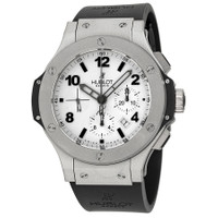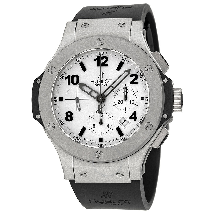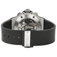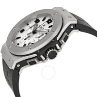 Platinum case with a black rubber strap. Fixed platinum bezel. Silver / grey dial with skeleton hands and alternating Arabic numeral and index hour markers. Minute markers around the outer rim. Dial Type: Analog. Date displays between the 4 and 5 o'clock positions. Chronograph - three sub-dials displaying: 60 second, 30 minute and 12 hour. Automatic movement with a 42 hour power reserve. Scratch resistant sapphire crystal. Pull / push crown. Transparent case back. Case diameter: 44 mm. Case thickness: 14.5 mm. Round case shape. Deployment clasp. Water resistant at 100 meters / 330 feet. Functions: chronograph, date, hour, minute, second. Additional Info: chronograph; date displays between 4 and 5 o'clock positions. Dress watch style. Watch label: Swiss Made. Hublot Big Bang Platinum Men's Watch 301.TI.450.RX. GENERAL Box Type: Original Box Color: Platinum / Silver / White CASE Case Size: 44 Case Thickness: 14.5 mm Case Material: Platinum Case Shape: Round Case Back: Transparent BAND Band Material: Rubber Band Type: Strap Band Color: Black Clasp: Deployment DIAL Dial Color: Silver / grey Type: Analog Crystal: Scratch Resistant Sapphire Hands: Skeleton Dial Markers: Alternating Arabic Numeral and Index Second Markers: Minute Markers around the outer rim Sub Dials: Three - 60 Second, 30 Minute and 12 Hour Bezel: Fixed Bezel Color: White Bezel Material: Platinum Crown: Pull / Push INFORMATION Brand: Hublot Series: Big Bang Collection Name: Big Bang Gender: Mens Model: 301.TI.450.RX Watch Label: Swiss Made Movement: Automatic Power Reserve: 42 hours FEATURES Water Resistance: 100 meters / 330 feet Calendar: Date display between 4 and 5 o'clock position Functions: Chronograph, Date, Hour, Minute, Second Watch Features: Analog, Platinum, Rubber, Chronograph ADDITIONAL INFO Watch Style: Dress Warranty: 2 Year Jomashop Warranty Additional Info: Chronograph; Date Displays Between 4 and 5 O'clock Positions Jomashop Sku: HB301TI450RX Item Variation: 301.TI.450.RX, 301-TI-450-RX, 301/TI/450/RX, 301TI450RX Department: Watches Category: Watches