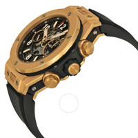 18kt rose gold case with a black rubber strap. Fixed 18kt rose gold bezel. Skeleton dial with luminous rose gold-tone hands and alternating index and Arabic numeral hour markers. Minute markers around the outer rim. Dial Type: Analog. Luminescent hands. Hublot calibre HUB1242 automatic movement with a 72-hour power reserve. Scratch resistant sapphire crystal. Screw down crown. Transparent case back. Case size: 45 mm. Round case shape. Band width: 23 mm. Band length: 8 inches. Fold over clasp with a push button release. Water resistant at 100 meters / 330 feet. Functions: chronograph, hour, minute, second. Luxury watch style. Watch label: Swiss Made. Item Variations: 411 OX 1180 RX, 411-OX-1180-RX, 411/OX/1180/RX, 411OX1180RX. Hublot Big Bang Skeleton Dial 18kt Rose Gold Men's Watch 411OX1180RX. GENERAL Box Type: Original Box CASE Case Size: 45 Case Material: 18kt Rose Gold Case Shape: Round Case Back: Transparent BAND Band Material: Rubber Band Type: Strap Band Color: Black Band Length: 8 inches Band Width: 23 mm Clasp: Fold Over with Push Button Release DIAL Dial Color: Skeleton Type: Analog Crystal: Scratch Resistant Sapphire Hands: Luminous Rose Gold-tone Dial Markers: Index and Arabic Numeral Second Markers: Minute Markers around the outer rim Sub Dials: Two - 60 Second and 60 Minute Luminiscence: Hands Bezel: Fixed Bezel Material: 18kt Rose Gold Crown: Screw Down INFORMATION Brand: Hublot Series: Big Bang Collection Name: Big Bang Gender: Mens Model: 411.OX.1180.RX Watch Label: Swiss Made Movement: Automatic Engine: Hublot Calibre HUB1242 Power Reserve: 72 hours FEATURES Water Resistance: 100 meters / 330 feet Calendar: Date display at the 3 o'clock position Functions: Chronograph, Flyback, Column Wheel, Date, Hour, Minute, Second Watch Features: Analog, Flyback, Gold, Rubber, Chronograph ADDITIONAL INFO Watch Style: Luxury Warranty: 2 Year Jomashop Warranty Jomashop Sku: HB411OX1180RX Item Variation: 411 OX 1180 RX, 411-OX-1180-RX, 411/OX/1180/RX, 411OX1180RX Department: Watches Category: Watches