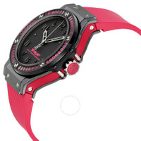 Black ceramic case with a red rubber strap. Fixed black PVD coated solid 18kt white goldbezel set with red spinel baguette crystals. Black dial with luminous black hands and alternating Arabic numeral and index hour markers. Minute markers around the outer rim. Dial Type: Analog. Luminescent hands. Quartz movement. Scratch resistant sapphire crystal. Pull / push crown. Solid case back. Round case shape. Case size: 38 mm. Fold over clasp. Water resistant at 100 meters / 330 feet. Functions: hour, minute, second. Big Bang Series. Luxury watch style. Watch label: Swiss Made. Item Variations: 361 CR 1110 RR 1913 AWF10, 361-CR-1110-RR-1913-AWF10, 361CR1110RR1913AWF10. Hublot Big Bang Tutti Frutti Ladies Watch 361CR1110RR1913AWF. INFORMATION Brand: Hublot Series: Big Bang Collection Name: Big Bang Gender: Womens Model: 361.CR.1110.RR.1913.AWF10 Watch Label: Swiss Made Movement: Quartz CASE Case Size: 38 mm Case Material: Ceramic Case Shape: Round Case Back: Solid BAND Band Material: Rubber Band Type: Strap Band Color: Red Clasp: Fold Over DIAL Dial Color: Black Type: Analog Crystal: Scratch Resistant Sapphire Hands: Luminous Black Dial Markers: Alternating Arabic Numeral and Index Second Markers: Minute Markers around the outer rim Luminiscence: Hands Bezel: Fixed Bezel Color: Black PVD coated solid Bezel Material: 18kt White Gold set with Red Spinel Baguette Crystals Crown: Pull / Push FEATURES Water Resistance: 100 meters / 330 feet Functions: Hour, Minute, Second Watch Features: Rubber, Gold, Ceramic, Analog ADDITIONAL INFO Watch Style: Luxury Warranty: 2 Year Jomashop Warranty UPC Code: 845960097062 Jomashop Sku: HB361CR1110RR1913AWF Item Variation: 361 CR 1110 RR 1913 AWF10, 361-CR-1110-RR-1913-AWF10, 361CR1110RR1913AWF10 Department: Watches Category: Watches