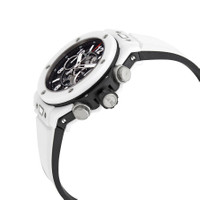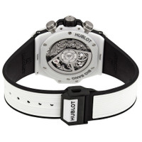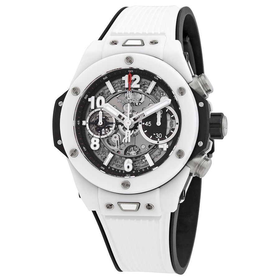 White ceramic case with a white (structured lined) rubber strap. Fixed white ceramic bezel. Black composite resin bezel lug and case band. Silver skeleton dial with luminous silver-tone hands and alternating Arabic numeral and index hour markers. Arabic numeral minute markers (at 5 minute intervals). Minute markers around the outer rim. Dial Type: Analog. Luminescent hands and markers. Date display at the 3 o'clock position. Chronograph - two sub-dials displaying: 60 second and 60 minute. Hublot calibre HUB1280 automatic movement, containing 43 Jewels, composed of 354 parts, bitting at 28800 vph, and has a power reserve of approximately 72 hours. Scratch resistant sapphire crystal. Screw down crown. Transparent case back. Round case shape. Case size: 42 mm. Case thickness: 14.5 mm. Fold over clasp with a push button release. Water resistant at 100 meters / 330 feet. Functions: chronograph, date, hour, minute, second. Big Bang Unico Series. Luxury watch style. Watch label: Swiss Made. Hublot Big Bang UNICO Automatic Chronograph White Ceramic Silver Dial Men's Watch 441.HX.1170.RX. INFORMATION Brand: Hublot Series: Big Bang Unico Collection Name: Big Bang UNICO Gender: Mens Model: 441.HX.1170.RX Watch Label: Swiss Made Movement: Automatic Engine: Hublot Calibre HUB1280 Power Reserve: 72 hours CASE Case Size: 42 mm Case Thickness: 14.5 mm Case Material: Ceramic Case Shape: Round Case Back: Transparent BAND Band Material: (Structured Lined) Rubber Band Type: Strap Band Color: White Clasp: Fold Over with Push Button Release DIAL Dial Color: Silver Skeleton Type: Analog Crystal: Scratch Resistant Sapphire Hands: Luminous Silver-tone Dial Markers: Alternating Arabic Numeral and Index Second Markers: Arabic Numeral Minute Markers (at 5 minute intervals). Minute Markers around the outer rim Sub Dials: Two - 60 Second and 60 Minute Luminiscence: Hands and Markers Bezel: Fixed Bezel Color: White Bezel Material: Ceramic Crown: Screw Down FEATURES Water Resistance: 100 meters / 330 feet Calendar: Date display at the 3 o'clock position Functions: Chronograph, Date, Hour, Minute, Second Watch Features: Chronograph, Rubber, Ceramic, Analog ADDITIONAL INFO Watch Style: Luxury Warranty: 2 Year Jomashop Warranty Jomashop Sku: HB441HX1170RX Department: Watches Category: Watches