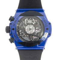 Blue stainless steel case with a blue rubber strap. Fixed blue ceramic bezel. Transparent dial with index-Arabic numeral hour markers. Dial Type: Analog. Date display at the 3 o'clock position. Chronograph - two sub-dials displaying: 60 minute and 60 second. Hublot Calibre HUB1280 Automatic movement, containing 43 Jewels, composed of 354 parts, bitting at 28800 vph, and has a power reserve of approximately 72 hours. Scratch resistant sapphire crystal. Screw down crown. Transparent see through case back. Round case shape, case size: 42 mm. Deployment clasp. Water resistant at 100 meters / 330 feet. Functions: chronograph, column wheel, hour, minute, second. Additional Info: original box, international warranty card, manual (complete accessories). Big Bang Series. Luxury watch style. Watch label: Swiss Made. Hublot Big Bang Unico Blue Magic Chronograph Automatic Men's Watch 441.ES.5119.RX. INFORMATION Brand: Hublot Series: Big Bang Collection Name: Big Bang Gender: Mens Model: 441.ES.5119.RX Watch Label: Swiss Made Movement: Automatic Engine: Hublot Calibre HUB1280 Power Reserve: 72 hours CASE Case Size: 42 mm Case Material: Stainless Steel Case Shape: Round Case Back: Transparent See Through BAND Band Material: Rubber Band Type: Strap Band Color: Blue Clasp: Deployment DIAL Dial Color: Transparent Type: Analog Crystal: Scratch Resistant Sapphire Hands: Blue Dial Markers: Index-Arabic Numeral Second Markers: Minute Markers around the outer rim Sub Dials: Two - 60 Minute and 60 Second Bezel: Fixed Bezel Color: Blue Bezel Material: Ceramic Crown: Screw Down FEATURES Water Resistance: 100 meters / 330 feet Calendar: Date display at the 3 o'clock position Functions: Chronograph, Column Wheel, Hour, Minute, Second Watch Features: Chronograph, Stainless Steel, Rubber, Ceramic, Analog ADDITIONAL INFO Watch Style: Luxury Warranty: 2 Year Jomashop Warranty Additional Info: Original Box, Manual (Complete Accessories) Jomashop Sku: HB441ES5119RX Department: Watches Category: Watches