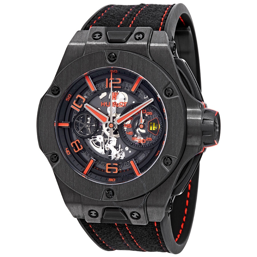 Black carbon fiber case with a black (calfskin) leather strap. Fixed black carbon fiber bezel. Black rubber inner bezel. Black skeleton dial with red hands and Arabic numeral and index hour markers. Minute markers around the outer rim. Dial Type: Analog. Luminescent hands and markers. Date display at the 3 o'clock position. 60 minute sub-dial at the 3 o'clock position. Hublot calibre HUB1241 automatic movement with a 72-hour power reserve. Scratch resistant sapphire crystal. Screw down crown. Transparent case back. Round case shape. Case size: 45 mm. Push button fold over clasp. Water resistant at 100 meters / 330 feet. Functions: chronograph, column wheel, flyback, date, hour, minute. Luxury watch style. Watch label: Swiss Made. Hublot Big Bang Unico Ferrari Chronograph Automatic Men's Watch 402.QU.0113.WR. GENERAL Box Type: Original Box CASE Case Size: 45 Case Material: Carbon Fiber Case Shape: Round Case Back: Transparent BAND Band Material: Calfskin Leather Band Type: Strap Band Color: Black Clasp: Push Button Fold Over DIAL Dial Color: Black Skeleton Type: Analog Crystal: Scratch Resistant Sapphire Hands: Red Dial Markers: Arabic Numeral and Index Second Markers: Minute Markers around the outer rim Sub Dials: One - 60 minute Luminiscence: Hands and Markers Bezel: Fixed Bezel Color: Black Bezel Material: Carbon Fiber. Black Rubber Inner Crown: Screw Down INFORMATION Brand: Hublot Series: Big Bang Collection Name: Big Bang Unico Gender: Mens Model: 402.QU.0113.WR Watch Label: Swiss Made Movement: Automatic Engine: Hublot Calibre HUB1241 Power Reserve: 72 hours FEATURES Water Resistance: 100 meters / 330 feet Calendar: Date display at the 3 o'clock position Functions: Chronograph, Column Wheel, FlyBack, Date, Hour, Minute Watch Features: Analog, Flyback, Leather, Rubber, Chronograph ADDITIONAL INFO Watch Style: Luxury Warranty: 2 Year Jomashop Warranty UPC Code: 842047137499 Additional Info: LIMITED EDITION OF 500 PIECES Jomashop Sku: HB402QU0113WR Department: Watches Category: Watches