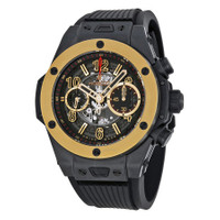 Microblasted and polished black ceramic case with a black rubber strap. Fixed yellow gold bezel. Skeleton dial with luminous yellow gold-tone hands and alternating Arabic numeral and index hour markers. Minute markers around the outer rim. Dial Type: Analog. Luminescent hands and markers. Date display at the 3 o'clock position. Chronograph - two sub-dials displaying: 60 second and 60 minute. Hublot calibre HUB1242 automatic movement with a 72-hour power reserve. Scratch resistant sapphire crystal. Screw down crown. Skeleton case back. Round case shape. Case size: 45.50 mm. Band width: 23 mm. Band length: 8 inches. Deployment clasp. Water resistant at 100 meters / 330 feet. Functions: chronograph, flyback, column wheel, date, hour, minute, second. Luxury watch style. Watch label: Swiss Made. Item Variations: 411 cm 1138 rx, 411-cm-1138-rx, 411/cm/1138/rx, 411cm1138rx. Hublot Big Bang Unico Magic Automatic Gold Skeleton Dial Black Rubber Men's Watch 411CM1138RX. GENERAL Box Type: Original Box CASE Case Size: 45 Case Material: Ceramic Case Shape: Round Case Back: Skeleton BAND Band Material: Rubber Band Type: Strap Band Color: Black Band Length: 8 inches Band Width: 23 mm Clasp: Deployment DIAL Dial Color: Skeleton Type: Analog Crystal: Scratch Resistant Sapphire Hands: Luminous Yellow Gold-tone Dial Markers: Alternating Arabic Numeral and Index Second Markers: Minute Markers around the outer rim Sub Dials: Two - 60 Second and 60 Minute Luminiscence: Hands and Markers Bezel: Fixed Bezel Material: Yellow Gold Crown: Screw Down INFORMATION Brand: Hublot Series: Big Bang Collection Name: Big Bang Unico Gender: Mens Model: 411.cm.1138.rx Watch Label: Swiss Made Movement: Automatic Engine: Hublot Calibre HUB1242 Power Reserve: 72 hours FEATURES Water Resistance: 100 meters / 330 feet Calendar: Date display at the 3 o'clock position Functions: Chronograph, Flyback, Column Wheel, Date, Hour, Minute, Second Watch Features: Analog, Flyback, Ceramic, Gold, Rubber, Chronograph ADDITIONAL INFO Watch Style: Luxury Warranty: 2 Year Jomashop Warranty UPC Code: 845960064637 Jomashop Sku: HB411CM1138RX Item Variation: 411 cm 1138 rx, 411-cm-1138-rx, 411/cm/1138/rx, 411cm1138rx Department: Watches Category: Watches