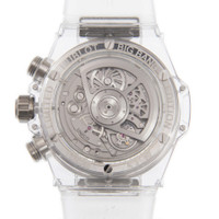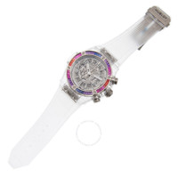 Grey titanium case with a transparent rubber strap. Fixed sapphire bezel. Transparent dial with silver-tone hands and Arabic numeral hour markers. Minute scale around the inner rim. Dial Type: Analog. Luminescent hands and markers. Date display at the 3 o'clock position. Chronograph - two sub-dials displaying: 60 minute and 60 second. Hublot Calibre HUB1280 Automatic movement, containing 43 Jewels, composed of 354 parts, bitting at 28800 vph, and has a power reserve of approximately 72 hours. Scratch resistant sapphire crystal. Screw down crown. Transparent case back. Round case shape, case size: 45 mm. Deployant clasp. Water resistant at 100 meters / 330 feet. Functions: date, hour, minute, second. Big Bang Unico Series. Luxury watch style. Watch label: Swiss Made. Hublot Big Bang Unico Sapphire Galaxy Automatic Men's Watch 411.JX.4803.RT.4098. GENERAL Box Type: Original Box CASE Case Size: 45 Case Material: Titanium Case Shape: Round Case Back: Transparent BAND Band Material: Rubber Band Type: Strap Band Color: Transparent Clasp: Deployant DIAL Dial Color: Transparent Type: Analog Crystal: Scratch Resistant Sapphire Hands: Silver-tone Dial Markers: Arabic Numeral Second Markers: Minute Scale around the inner rim Sub Dials: Two - 60 Minute and 60 Second Luminiscence: Hands and Markers Bezel: Fixed Bezel Material: Sapphire Crown: Screw Down INFORMATION Brand: Hublot Series: Big Bang Collection Name: Big Bang Unico Gender: Mens Model: 411.JX.4803.RT.4098 Watch Label: Swiss Made Movement: Automatic Engine: Hublot Calibre HUB1280 Power Reserve: 72 hours FEATURES Water Resistance: 100 meters / 330 feet Calendar: Date display at the 3 o'clock position Functions: Date, Hour, Minute, Second Watch Features: Analog, Rubber, Titanium, Chronograph ADDITIONAL INFO Watch Style: Luxury Warranty: 2 Year Jomashop Warranty Jomashop Sku: HB411JX4803RT4098 Department: Watches Category: Watches