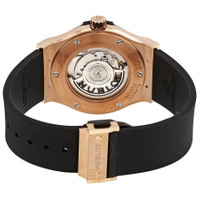 18kt rose gold case set with diamonds with a black rubber strap. Fixed 18kt rose gold bezel set with diamonds. Black dial with rose gold hands and index hour markers. Dial Type: Analog. Date display at the 3 o'clock position. Automatic movement with a 42-hour power reserve. Scratch resistant sapphire crystal. Pull / push crown. Transparent case back. Round case shape. Case size: 42 mm. Fold over clasp with a push button release. Water resistant at 50 meters / 165 feet. Functions: date, hour, minute, second. Classic Fusion Series. Luxury watch style. Watch label: Swiss Made. Hublot Classic Fusion 18K Rose Gold Automatic Black Dial Watch 542OX1181RX1704. GENERAL Box Type: Original Box CASE Case Size: 42 Case Material: 18kt Rose Gold set with Diamonds Case Shape: Round Case Back: Transparent BAND Band Material: Rubber Band Type: Strap Band Color: Black Clasp: Fold Over with Push Button Release DIAL Dial Color: Black Type: Analog Crystal: Scratch Resistant Sapphire Hands: Rose Gold Dial Markers: Index Bezel: Fixed Bezel Material: 18kt Rose Gold set with Diamonds Crown: Pull / Push INFORMATION Brand: Hublot Series: Classic Fusion Collection Name: Classic Fusion Gender: Mens Model: 542.OX.1181.LR.1704 Watch Label: Swiss Made Movement: Automatic Power Reserve: 42 Hour FEATURES Water Resistance: 50 meters / 165 feet Calendar: Date display at the 3 o'clock position Functions: Date, Hour, Minute, Second Watch Features: Analog, Gold, Rubber, Diamond ADDITIONAL INFO Watch Style: Luxury Warranty: 2 Year Jomashop Warranty UPC Code: 842047187722 Jomashop Sku: HB542OX1181RX1704 Department: Watches Category: Watches