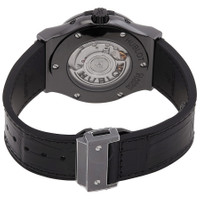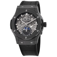 Black ceramic case with a black leather strap. Fixed ceramic bezel. Silver-tone dial with silver-tone hands and index hour markers. Minute markers around the outer rim. Dial Type: Analog. Complete calendar. Three sub-dials displaying: month, day, date/moonphase. Hublot Calibre HUB1131 Automatic movement, containing 25 Jewels, composed of 134 parts, bitting at 28800 vph, and has a power reserve of approximately 42 hours. Scratch resistant sapphire crystal. Screw down crown. Transparent case back. Round case shape, case size: 42 mm. Deployment clasp. Water resistant at 50 meters / 165 feet. Functions: full calendar, moon phase, month, date, day, hour, minute, second. Additional Info: original box, international warranty card, manual (complete accessories). Classic Fusion Aerofusion Series. Luxury watch style. Watch label: Swiss Made. Hublot Classic Fusion Aerofusion Moonphase Black Magic Automatic Silver Dial Men's Watch 547.CX.0170.LR. GENERAL Box Type: Original Box CASE Case Size: 42 Case Material: Ceramic Case Shape: Round Case Back: Transparent BAND Band Material: Leather Band Type: Strap Band Color: Black Clasp: Deployment DIAL Dial Color: Silver-tone Type: Analog Crystal: Scratch Resistant Sapphire Hands: Silver-tone Dial Markers: Index Second Markers: Minute Markers around the outer rim Sub Dials: Three - Month, Day, Date/Moonphase Bezel: Fixed Bezel Material: Ceramic Crown: Screw Down INFORMATION Brand: Hublot Series: Classic Fusion Collection Name: Classic Fusion Aerofusion Gender: Mens Model: 547.CX.0170.LR Watch Label: Swiss Made Movement: Automatic Engine: Hublot Calibre HUB1131 Power Reserve: 42 hours FEATURES Water Resistance: 50 meters / 165 feet Calendar: Complete Calendar Functions: Full Calendar, Moon Phase, Month, Date, Day, Hour, Minute, Second Watch Features: Analog, Month, Ceramic, Leather, Moon Phase ADDITIONAL INFO Watch Style: Luxury Warranty: 2 Year Jomashop Warranty Additional Info: Original Box, Manual (Complete Accessories) Jomashop Sku: HB547CX0170LR Department: Watches Category: Watches