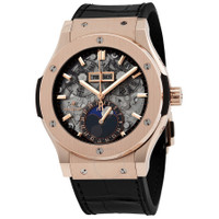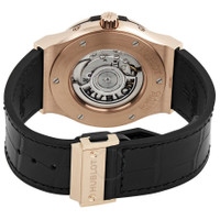 18kt king gold case with a black rubber strap with a stiched black (alligator) leather top. Fixed 18kt king gold bezel. Black composite resin bezel lug sandwiched between the bezel and case. Sapphire dial with rose gold-plated hands and index hour markers. Minute markers around the outer rim. Dial Type: Analog. Date display at the 6 o'clock position. Three sub-dials displaying: month, day, date/moonphase. Hublot calibre HUB1131 automatic movement, containing 25 Jewels, composed of 134 parts, bitting at 28800 vph, and has a power reserve of approximately 42 hours. Scratch resistant sapphire crystal. Screw down crown. Transparent case back. Round case shape. Case size: 45 mm. Deployment clasp. Water resistant at 100 meters / 330 feet. Functions: moon phase, month, date, day, hour, minute, second. Classic Fusion Aerofusion Series. Luxury watch style. Watch label: Swiss Made. Item Variations: 517 OX 0180 LR, 517-OX-0180-LR, 517/OX/0180/LR, 517OX0180LR. Hublot Classic Fusion Aerofusion Moonphase Sapphire Dial 18kt King Gold Men's Watch 517.NX.0170.LR. GENERAL Box Type: Original Box CASE Case Size: 45 Case Material: 18kt King Gold Case Shape: Round Case Back: Transparent BAND Band Material: Rubber with a Black (Alligator) Leather Top Band Type: Strap Band Color: Black Clasp: Deployment DIAL Dial Color: Sapphire Type: Analog Crystal: Scratch Resistant Sapphire Hands: Rose Gold-plated Dial Markers: Index Second Markers: Minute Markers around the outer rim Sub Dials: Three - Month, Day, Date/Moonphase Bezel: Fixed Bezel Material: 18kt King Gold Crown: Screw Down INFORMATION Brand: Hublot Series: Classic Fusion Collection Name: Classic Fusion Aerofusion Gender: Mens Model: 517.OX.0180.LR Watch Label: Swiss Made Movement: Automatic Engine: Hublot Calibre HUB1131 Power Reserve: 42 hours FEATURES Water Resistance: 100 meters / 330 feet Calendar: Date display at the 6 o'clock position Functions: Moon Phase, Month, Date, Day, Hour, Minute, Second Watch Features: Alligator Leather, Analog, Month, Gold, Leather, Rubber, Moon Phase ADDITIONAL INFO Watch Style: Luxury Warranty: 2 Year Jomashop Warranty Jomashop Sku: HB517OX0180LR Item Variation: 517 OX 0180 LR, 517-OX-0180-LR, 517/OX/0180/LR, 517OX0180LR Department: Watches Category: Watches