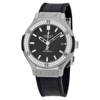 Titanium case with a black alligator leather strap. Fixed titanium set with diamonds bezel. Black dial with silver-tone skeleton hands and index hour markers. Dial Type: Analog. Date display at the 3 o'clock position. Automatic movement with a 42 hour power reserve. Scratch resistant sapphire crystal. Skeleton case back. Case diameter: 38 mm. Round case shape. Band width: 22.9 mm. Band length: 9 inches. Fold over clasp with push button release. Water resistant at 50 meters / 165 feet. Luxury watch style. Hublot Classic Fusion Automatic Black Dial Black Leather Men's Watch 565NX1170LR1104. GENERAL Box Type: Original Box CASE Case Diameter: 38 mm Case Material: Titanium Case Shape: Round Case Back: Skeleton BAND Band Material: Alligator Leather Band Type: Strap Band Color: Black Band Length: 9 inches Band Width: 22.9 mm Clasp: Fold Over with Push Button Release DIAL Dial Color: Black Type: Analog Crystal: Scratch Resistant Sapphire Hands: Silver-tone Skeleton Dial Markers: Index Bezel: Fixed Bezel Color: Grey Bezel Material: Titanium set with Diamonds INFORMATION Brand: Hublot Series: Classic Fusion Collection Name: Classic Fusion Gender: Mens Model: 565.NX.1170.LR.1104 Watch Label: Swiss Made Movement: Automatic Engine: Hublot Caliber HUB1110 Power Reserve: 42 hours FEATURES Water Resistance: 50 meters / 165 feet Calendar: Date display at the 3 o'clock position Functions: Date, Hour, Minute, Second Watch Features: Alligator Leather, Analog, Leather, Titanium, Diamond ADDITIONAL INFO Watch Style: Luxury Warranty: 2 Year Jomashop Warranty Jomashop Sku: HB565NX1170LR1104 Item Variation: 565 NX 1170 LR 1104, 565-NX-1170-LR-1104, 565/NX/1170/LR/1104, 565NX1170LR1104 Department: Watches Category: Watches