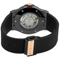 Ceramic case with a black rubber strap. Fixed 18kt rose gold bezel. Black dial with rose gold hands and index hour markers. Dial Type: Analog. Date display at the 3 o'clock position. Hublot Calibre HUB1112 Automatic movement, based upon Sellita SW300-1, containing 25 Jewels, composed of 63 parts, bitting at 28800 vph, and has a power reserve of approximately 42 hours. Scratch resistant sapphire crystal. Pull / push crown. Transparent case back. Round case shape, case size: 45 mm. Push button folding clasp. Water resistant at 50 meters / 150 feet. Functions: date, hour, minute, second. Classic Fusion Series. Luxury watch style. Watch label: Swiss Made. Hublot Classic Fusion Automatic Black Dial Men's Watch 511.CO.1181.RX. INFORMATION Brand: Hublot Series: Classic Fusion Collection Name: Classic Fusion Gender: Mens Model: 511.CO.1181.RX Watch Label: Swiss Made Movement: Automatic Engine: Hublot Calibre HUB1112 CASE Case Size: 45 mm Case Material: Ceramic Case Shape: Round Case Back: Transparent BAND Band Material: Rubber Band Type: Strap Band Color: Black Clasp: Push Button Folding Clasp DIAL Dial Color: Black Type: Analog Crystal: Scratch Resistant Sapphire Hands: Rose Gold Dial Markers: Index Bezel: Fixed Bezel Material: 18KT Rose Gold Crown: Pull / Push FEATURES Water Resistance: 50 meters / 150 feet Calendar: Date display at the 3 o'clock position Functions: Date, Hour, Minute, Second Watch Features: Rubber, Gold, Ceramic, Analog ADDITIONAL INFO Watch Style: Luxury Warranty: 2 Year Jomashop Warranty Jomashop Sku: HB511CO1181RX Department: Watches Category: Watches