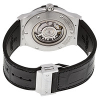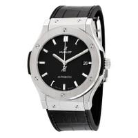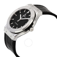 Grey titanium case with a rubber with a black (alligator) leather top strap. Fixed grey titanium bezel. Black dial with silver-tone hands and index hour markers. Dial Type: Analog. Date display at the 3 o'clock position. Hublot Calibre HUB1112 Automatic movement, based upon Sellita SW300-1, containing 25 Jewels, composed of 63 parts, bitting at 28800 vph, and has a power reserve of approximately 42 hours. Scratch resistant sapphire crystal. Pull / push crown. Transparent case back. Round case shape, case size: 45 mm. Band width: 20 mm. Fold over clasp with a push button release. Water resistant at 50 meters / 165 feet. Functions: date, hour, minute, second. Classic Fusion Series. Luxury watch style. Watch label: Swiss Made. Hublot Classic Fusion Automatic Black Dial Men's Watch 511.NX.1171.LR. GENERAL Box Type: Original Box CASE Case Size: 45 Case Material: Titanium Case Shape: Round Case Back: Transparent BAND Band Material: Rubber with a Black (Alligator) Leather Top Band Type: Strap Band Color: Black Band Width: 20 mm Clasp: Fold Over with Push Button Release DIAL Dial Color: Black Type: Analog Crystal: Scratch Resistant Sapphire Hands: Silver-tone Dial Markers: Index Bezel: Fixed Bezel Color: Grey Bezel Material: Titanium Crown: Pull / Push INFORMATION Brand: Hublot Series: Classic Fusion Collection Name: Classic Fusion Gender: Mens Model: 511.NX.1171.LR Watch Label: Swiss Made Movement: Automatic Engine: Hublot Calibre HUB1112 Power Reserve: 42 hours FEATURES Water Resistance: 50 meters / 165 feet Calendar: Date display at the 3 o'clock position Functions: Date, Hour, Minute, Second Watch Features: Alligator Leather, Analog, Leather, Rubber, Titanium ADDITIONAL INFO Watch Style: Luxury Warranty: 2 Year Jomashop Warranty UPC Code: 845960068253 Jomashop Sku: HB511NX1171LR Department: Watches Category: Watches