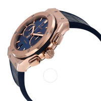 18kt king gold case with a blue rubber strap with a stiched blue (alligator) leather top. Fixed 18kt king gold bezel. Blue composite resin bezel lug sandwiched between the bezel and case. Blue sunray dial with rose gold hands and index hour markers. Minute markers around the outer rim. Dial Type: Analog. Date display at the 6 o'clock position. Chronograph - two sub-dials displaying: 60 second and 30 minute. Hublot calibre HUB1143 automatic movement, based upon ETA 2892-A2, containing 59 Jewels, bitting at 28800 vph, and has a power reserve of approximately 42 hours. Scratch resistant sapphire crystal. Pull / push crown. Transparent case back. Round case shape. Case size: 45 mm. Band width: 20 mm. Deployment clasp with a push button release. Water resistant at 50 meters / 165 feet. Functions: chronograph, date, hour, minute, second. Classic Fusion Series. Luxury watch style. Watch label: Swiss Made. Item Variations: 521 OX 7180 LR, 521-OX-7180-LR, 521/OX/7180/LR, 521OX7180LR. Hublot Classic Fusion Automatic Blue Sunray Dial 18kt King Gold Men's Watch 521.OX.7180.LR. GENERAL Box Type: Original Box CASE Case Size: 45 Case Material: 18kt King Gold Case Shape: Round Case Back: Transparent BAND Band Material: Rubber with a Blue (Alligator) Leather Top Band Type: Strap Band Color: Blue Band Width: 20 mm Clasp: Deployment with Push Button Release DIAL Dial Color: Blue Sunray Type: Analog Crystal: Scratch Resistant Sapphire Hands: Rose Gold Dial Markers: Index Second Markers: Minute Markers around the outer rim Sub Dials: Two - 60 Second and 30 Minute Bezel: Fixed Bezel Material: 18kt King Gold Crown: Pull / Push INFORMATION Brand: Hublot Series: Classic Fusion Collection Name: Classic Fusion Gender: Mens Model: 521.OX.7180.LR Watch Label: Swiss Made Movement: Automatic Engine: Hublot Calibre HUB1143 Power Reserve: 42 hours FEATURES Water Resistance: 50 meters / 165 feet Calendar: Date display at the 6 o'clock position Functions: Chronograph, Date, Hour, Minute, Second Watch Features: Alligator Leather, Analog, Gold, Leather, Rubber, Chronograph ADDITIONAL INFO Watch Style: Luxury Warranty: 2 Year Jomashop Warranty UPC Code: 845960069632 Jomashop Sku: HB521OX7180LR Item Variation: 521 OX 7180 LR, 521-OX-7180-LR, 521/OX/7180/LR, 521OX7180LR Department: Watches Category: Watches
