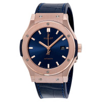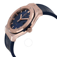 18kt rose gold case with a rubber strap with a blue (alligator) leather inlay. Fixed 18kt rose gold bezel. Blue sunray dial with rose gold hands and index hour markers. Dial Type: Analog. Date display at the 3 o'clock position. Hublot calibre HUB1110 automatic movement, based upon Sellita SW300-1, containing 21 Jewels, bitting at 28800 vph, and has a power reserve of approximately 42 hours. Scratch resistant sapphire crystal. Pull / push crown. Skeleton case back. Round case shape. Case size: 42 mm. Band width: 25 mm. Deploymen tclasp with a push button release. Water resistant at 50 meters / 165 feet. Functions: date, hour, minute, second. Luxury watch style. Watch label: Swiss Made. Hublot Classic Fusion Automatic Blue Sunray Dial 18kt Rose Gold Men's Watch 542.OX.7180.LR. GENERAL Box Type: Original Box CASE Case Size: 42 Case Material: 18kt Rose Gold Case Shape: Round Case Back: Skeleton BAND Band Material: Rubber (with a Blue Alligator Leather Inlay) Band Type: Strap Band Color: Blue Band Width: 25 mm Clasp: Deployment with Push Button Release DIAL Dial Color: Blue Sunray Type: Analog Crystal: Scratch Resistant Sapphire Hands: Rose Gold Dial Markers: Index Bezel: Fixed Bezel Material: 18kt Rose Gold Crown: Pull / Push INFORMATION Brand: Hublot Series: Classic Fusion Collection Name: Classic Fusion Gender: Mens Model: 542.OX.7180.LR Watch Label: Swiss Made Movement: Automatic Engine: Hublot Calibre HUB1110 Power Reserve: 42 hours FEATURES Water Resistance: 50 meters / 165 feet Calendar: Date display at the 3 o'clock position Functions: Date, Hour, Minute, Second Watch Features: Alligator Leather, Analog, Gold, Leather, Rubber ADDITIONAL INFO Watch Style: Luxury Warranty: 2 Year Jomashop Warranty UPC Code: 603531784755 Jomashop Sku: HB542OX7180LR Department: Watches Category: Watches