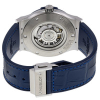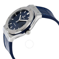 Grey (satin-finished) titanium case with a rubber (blue alligator leather inlay) strap. Fixed grey (satin-finished) titanium bezel. Blue sunray satin-finished dial with polished rhodium-plated hands and index hour markers. Dial Type: Analog. Date display at the 3 o'clock position. Hublot calibre HUB1112 automatic movement, based upon Sellita SW300-1, containing 25 Jewels, composed of 63 parts, bitting at 28800 vph, and has a power reserve of approximately 42 hours. Scratch resistant sapphire crystal. Pull / push crown. Skeleton case back. Round case shape. Case size: 45 mm. Case thickness: 10.5 mm. Band width: 20 mm. Deployment clasp. Water resistant at 50 meters / 165 feet. Functions: date, hour, minute, second. Classic Fusion Series. Luxury watch style. Watch label: Swiss Made. Item Variations: 511 NX 7170 LR, 511-NX-7170-LR, 511/NX/7170/LR, 511NX7170LR. Hublot Classic Fusion Automatic Blue Sunray Dial Titanium Men's Watch 511.NX.7170.LR. GENERAL Box Type: Original Box CASE Case Size: 45 Case Thickness: 10.5 mm Case Material: (Satin-finished) Titanium Case Shape: Round Case Back: Skeleton BAND Band Material: Rubber (Blue Alligator Leather Inlay) Band Type: Strap Band Color: Blue Band Width: 20 mm Clasp: Deployment DIAL Dial Color: Blue Sunray Satin-finished Type: Analog Crystal: Scratch Resistant Sapphire Hands: Polished Rhodium-plated Dial Markers: Index Bezel: Fixed Bezel Color: Grey Bezel Material: (Satin-finished) Titanium Crown: Pull / Push INFORMATION Brand: Hublot Series: Classic Fusion Collection Name: Classic Fusion Gender: Mens Model: 511.NX.7170.LR Watch Label: Swiss Made Movement: Automatic Engine: Hublot Calibre HUB1112 Power Reserve: 42 hours FEATURES Water Resistance: 50 meters / 165 feet Calendar: Date display at the 3 o'clock position Functions: Date, Hour, Minute, Second Watch Features: Alligator Leather, Analog, Leather, Rubber, Titanium ADDITIONAL INFO Watch Style: Luxury Warranty: 2 Year Jomashop Warranty UPC Code: 845960072007 Jomashop Sku: HB511NX7170LR Item Variation: 511 NX 7170 LR, 511-NX-7170-LR, 511/NX/7170/LR, 511NX7170LR Department: Watches Category: Watches