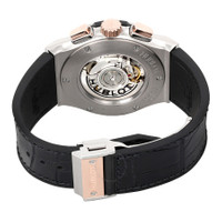 Grey titanium case with a black rubber strap with a stiched black (alligator) leather top. Fixed 18kt king gold bezel. Mat black dial with rose gold-tone hands and index hour markers. Minute markers around the outer rim. Dial Type: Analog. Date display at the 6 o'clock position. Chronograph - two sub-dials displaying: 60 seconds, 30 minute. Hublot calibre HUB1143 automatic movement, based upon ETA 2892-A2, containing 59 Jewels, bitting at 28800 vph, and has a power reserve of approximately 42 hours. Scratch resistant sapphire crystal. Pull / push crown. Transparent case back. Round case shape. Case size: 45 mm. Band width: 20 mm. Fold over clasp. Water resistant at 50 meters / 165 feet. Functions: chronograph, date, hour, minute, second. Classic Fusion Series. Luxury watch style. Watch label: Swiss Made. Hublot Classic Fusion Automatic Chronograph Men's Watch 521.NO.1181.LR. GENERAL Box Type: Original Box CASE Case Size: 45 Case Material: Titanium Case Shape: Round Case Back: Transparent BAND Band Material: Rubber with a Black (Alligator) Leather Top Band Type: Strap Band Color: Black Band Width: 20 mm Clasp: Fold Over DIAL Dial Color: Mat Black Type: Analog Crystal: Scratch Resistant Sapphire Hands: Rose Gold-tone Dial Markers: Index Second Markers: Minute Markers around the outer rim Sub Dials: Two - 60 Second and 30 Minute Bezel: Fixed Bezel Material: 18kt King Gold Crown: Pull / Push INFORMATION Brand: Hublot Series: Classic Fusion Collection Name: Classic Fusion Gender: Mens Model: 521.NO.1181.LR Watch Label: Swiss Made Movement: Automatic Engine: Hublot Calibre HUB1143 Power Reserve: 42 hours FEATURES Water Resistance: 50 meters / 165 feet Calendar: Date display at the 6 o'clock position Functions: Chronograph, Date, Hour, Minute, Second Watch Features: Alligator Leather, Analog, Gold, Leather, Rubber, Titanium, Chronograph ADDITIONAL INFO Watch Style: Luxury Warranty: 2 Year Jomashop Warranty Jomashop Sku: HB521NO1181LR Department: Watches Category: Watches