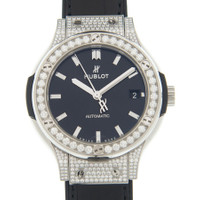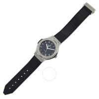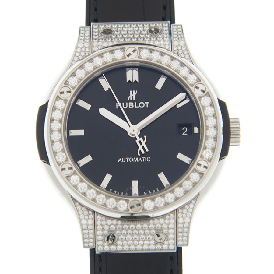 Grey titanium (diamond pave) case with a black (alligator) leather strap. Fixed grey titanium bezel set with diamonds. Black composite resin bezel lug sandwiched between the bezel and case. Black dial with grey hands and index hour markers. Dial Type: Analog. Date display at the 3 o'clock position. Hublot caliber HUB1110 automatic movement, based upon Sellita SW300-1, containing 25 Jewels, bitting at 28800 vph, and has a power reserve of approximately 42 hours. Scratch resistant sapphire crystal. Skeleton case back. Round case shape. Case size: 38 mm. Band width: 22.9 mm. Band length: 9 inches. Fold over clasp with a push button release. Water resistant at 50 meters / 165 feet. Functions: date, hour, minute, second. Classic Fusion Series. Luxury watch style. Watch label: Swiss Made. Hublot Classic Fusion Automatic Diamond Black Dial Men's Watch 565.NX.1470.LR.1604. GENERAL Box Type: Original Box CASE Case Size: 38 Case Material: Titanium (Diamond Pave) Case Shape: Round Case Back: Skeleton BAND Band Material: (Alligator) Leather Band Type: Strap Band Color: Black Band Length: 9 inches Band Width: 22.9 mm Clasp: Fold Over with Push Button Release DIAL Dial Color: Black Type: Analog Crystal: Scratch Resistant Sapphire Hands: Grey Dial Markers: Index Bezel: Fixed Bezel Color: Grey Bezel Material: Titanium set with Diamonds Crown: Pull / Push INFORMATION Brand: Hublot Series: Classic Fusion Collection Name: Classic Fusion Gender: Mens Model: 565.NX.1470.LR.1604 Watch Label: Swiss Made Movement: Automatic Engine: Hublot Caliber HUB1110 Power Reserve: 42 hours FEATURES Water Resistance: 50 meters / 165 feet Calendar: Date display at the 3 o'clock position Functions: Date, Hour, Minute, Second Watch Features: Alligator Leather, Analog, Leather, Titanium, Diamond ADDITIONAL INFO Watch Style: Luxury Warranty: 2 Year Jomashop Warranty Jomashop Sku: HB565NX1470LR1604 Department: Watches Category: Watches