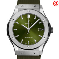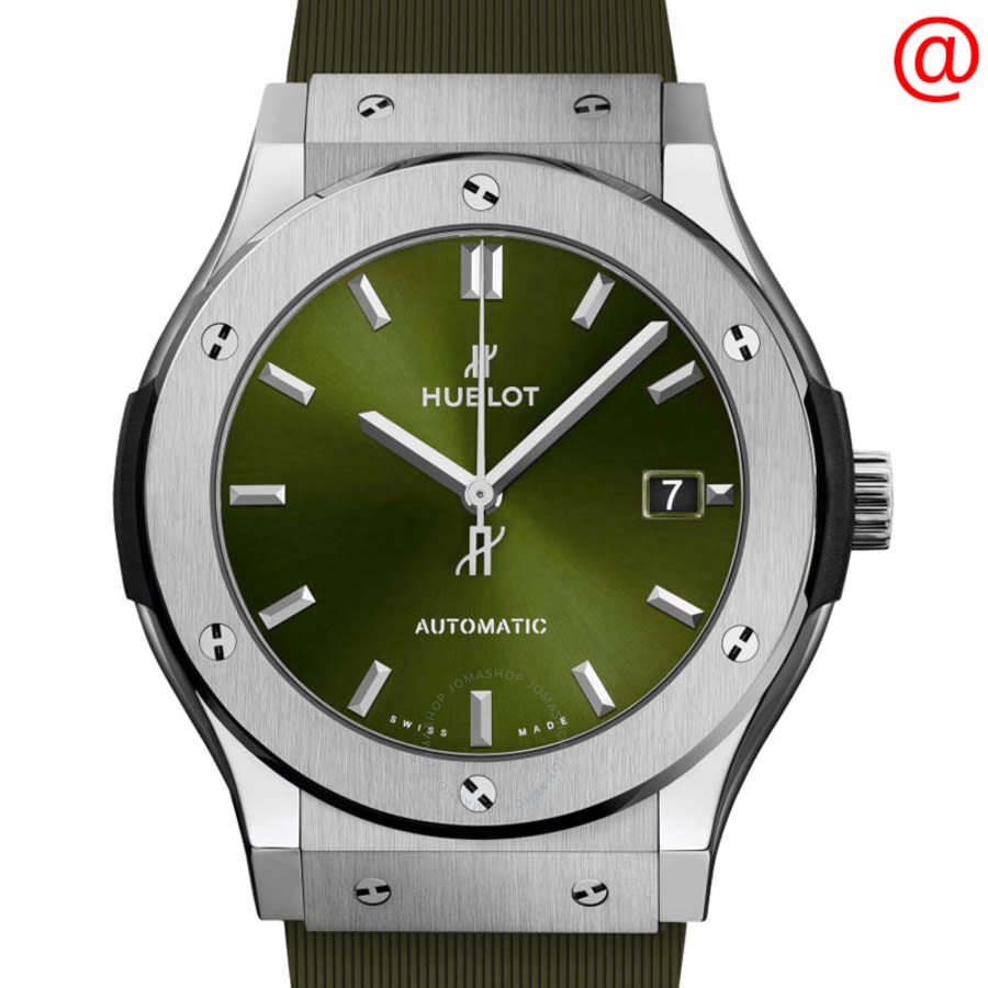Silver-tone stainless steel case with a green rubber strap. Fixed silver-tone stainless steel bezel. Green dial with silver-tone hands and index hour markers. Dial Type: Analog. Date display at the 3 o'clock position. Hublot Calibre HUB1112 Automatic movement, based upon Sellita SW300-1, containing 25 Jewels, composed of 63 parts, bitting at 28800 vph, and has a power reserve of approximately 42 hours. Scratch resistant sapphire crystal. Round case shape, case size: 45 mm. Deployment with push button release clasp. Water resistant at 50 meters / 165 feet. Functions: date, hour, minute, second. Additional Info: original box, international warranty card, manual (complete accessories). Classic Fusion Series. Luxury watch style. Watch label: Swiss Made. Hublot Classic Fusion Automatic Green Dial Men's Watch 511.NX.8970.RX. INFORMATION Brand: Hublot Series: Classic Fusion Collection Name: Classic Fusion Gender: Mens Model: 511.NX.8970.RX Watch Label: Swiss Made Movement: Automatic Engine: Hublot Calibre HUB1112 Power Reserve: 42 hours CASE Case Size: 45 mm Case Material: Stainless Steel Case Shape: Round BAND Band Material: Rubber Band Type: Strap Band Color: Green Clasp: Deployment with Push Button Release DIAL Dial Color: Green Type: Analog Crystal: Scratch Resistant Sapphire Hands: Silver-tone Dial Markers: Index Bezel: Fixed Bezel Color: Silver-tone Bezel Material: Stainless Steel FEATURES Water Resistance: 50 meters / 165 feet Calendar: Date display at the 3 o'clock position Functions: Date, Hour, Minute, Second Watch Features: Stainless Steel, Rubber, Analog ADDITIONAL INFO Watch Style: Luxury Warranty: 2 Year Jomashop Warranty Additional Info: Original Box, International Warranty Card, Manual (Complete Accessories) Jomashop Sku: HB511NX8970RX Department: Watches Category: Watches
