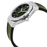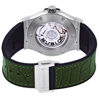 Satin-finished and polished titanium case with a black rubber strap with a green (alligator) leather top. Fixed polished titanium bezel. Black composite resin bezel lugs sandwiched between the bezel and case. Green sunray dial with silver-tone hands and index hour markers. Dial Type: Analog. Date display at the 3 o'clock position. Hublot calibre HUB1110 automatic movement, based upon Sellita SW300-1, containing 21 Jewels, composed of 63 parts, bitting at 28800 vph, and has a power reserve of approximately 42 hours. Scratch resistant sapphire crystal. Push / pull crown. Transparent case back. Round case shape, case size: 42 mm. Deployment clasp with a push button release. Water resistant at 50 meters / 165 feet. Functions: date, hour, minute, second. Classic Fusion Series. Luxury watch style. Watch label: Swiss Made. Hublot Classic Fusion Automatic Green Dial Men's Watch 542.NX.8970.LR. INFORMATION Brand: Hublot Series: Classic Fusion Collection Name: Classic Fusion Gender: Mens Model: 542.NX.8970.LR Watch Label: Swiss Made Movement: Automatic Engine: Hublot Calibre HUB1110 Power Reserve: 42 hours CASE Case Size: 42 mm Case Material: Satin-finished and Polished Titanium Case Shape: Round Case Back: Transparent BAND Band Material: Rubber with a Green (Alligator) Leather Top Band Type: Strap Band Color: Black Clasp: Deployment with Push Button Release DIAL Dial Color: Green Sunray Type: Analog Crystal: Scratch Resistant Sapphire Hands: Silver-tone Dial Markers: Index Bezel: Fixed Bezel Color: Silver-tone Bezel Material: Polished Titanium Crown: Pull / Push FEATURES Water Resistance: 50 meters / 165 feet Calendar: Date display at the 3 o'clock position Functions: Date, Hour, Minute, Second Watch Features: Titanium, Rubber, Leather, Analog, Alligator Leather ADDITIONAL INFO Watch Style: Luxury Warranty: 2 Year Jomashop Warranty UPC Code: 842047140666 Jomashop Sku: HB542NX8970LR Department: Watches Category: Watches