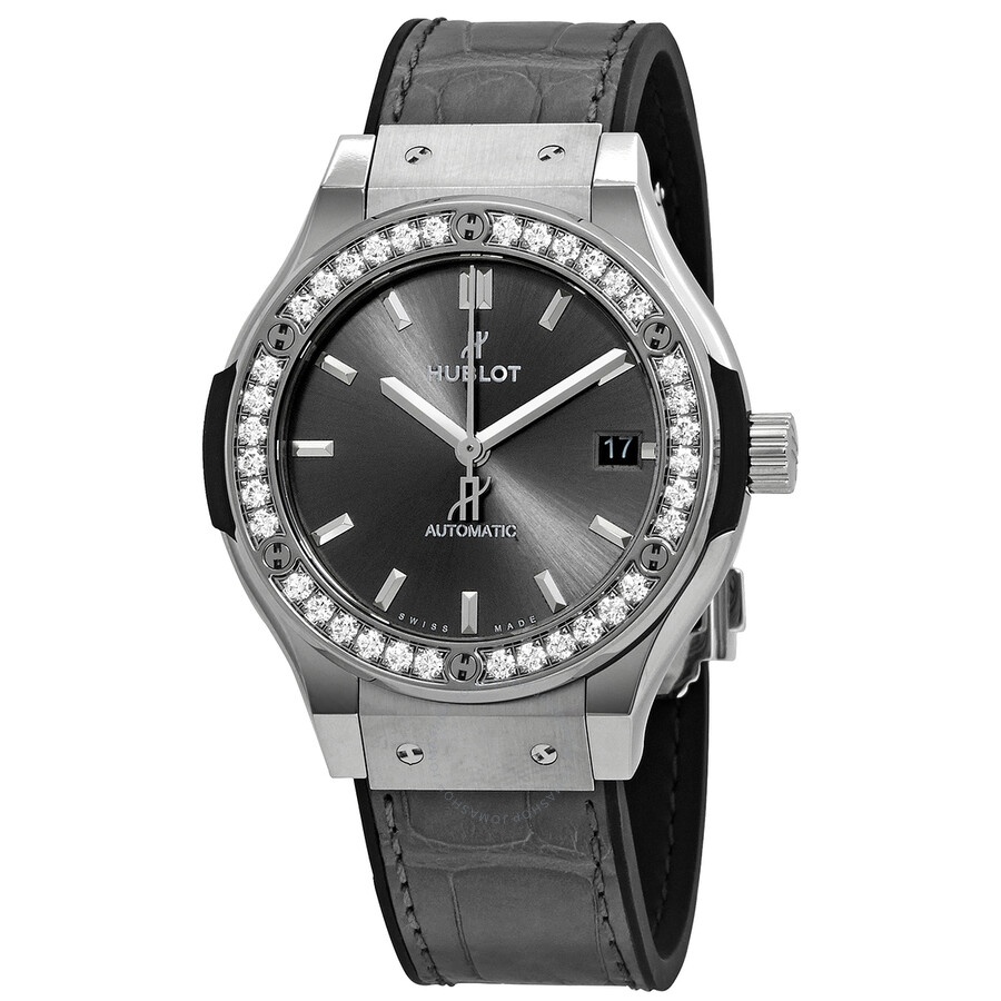 Grey titanium case with a black rubber strap with a stiched grey (alligator) leather top. Fixed grey titanium bezel set with 36 diamonds. Black composite resin bezel lug sandwiched between the bezel and case. Grey dial with polished rhodium-plated hands and index hour markers. Dial Type: Analog. Date display at the 3 o'clock position. Hublot calibre HUB1110 automatic movement, based upon Sellita SW300-1, containing 21 Jewels, composed of 63 parts, bitting at 28800 vph, and has a power reserve of approximately 42 hours. Scratch resistant sapphire crystal. Pull / push crown. Transparent case back. Round case shape, case size: 38 mm. Fold over clasp with a push button release. Water resistant at 50 meters / 165 feet. Functions: date, hour, minute, second. Additional Info: bezel set with 36 diamonds (about 1.20 carats). Classic Fusion Series. Luxury watch style. Watch label: Swiss Made. Hublot Classic Fusion Automatic Grey Dial Men's Watch 565.NX.7071.LR.1204. GENERAL Box Type: Original Box CASE Case Size: 38 Case Material: Titanium Case Shape: Round Case Back: Transparent BAND Band Material: Rubber with a Grey (Alligator) Leather Band Type: Strap Band Color: Black Clasp: Fold Over with Push Button Release DIAL Dial Color: Grey Type: Analog Crystal: Scratch Resistant Sapphire Hands: Polished Rhodium-plated Dial Markers: Index Bezel: Fixed Bezel Color: Grey Bezel Material: Titanium set with 36 Diamonds Crown: Pull / Push INFORMATION Brand: Hublot Series: Classic Fusion Collection Name: Classic Fusion Gender: Mens Model: 565.NX.7071.LR.1204 Watch Label: Swiss Made Movement: Automatic Engine: Hublot Calibre HUB1110 Power Reserve: 42 hours FEATURES Water Resistance: 50 meters / 165 feet Calendar: Date display at the 3 o'clock position Functions: Date, Hour, Minute, Second Watch Features: Alligator Leather, Analog, Leather, Rubber, Titanium, Diamond ADDITIONAL INFO Watch Style: Luxury Warranty: 2 Year Jomashop Warranty Additional Info: bezel set with 36 diamonds (about 1.20 carats) Jomashop Sku: HB565NX7071LR1204 Department: Watches Category: Watches