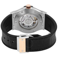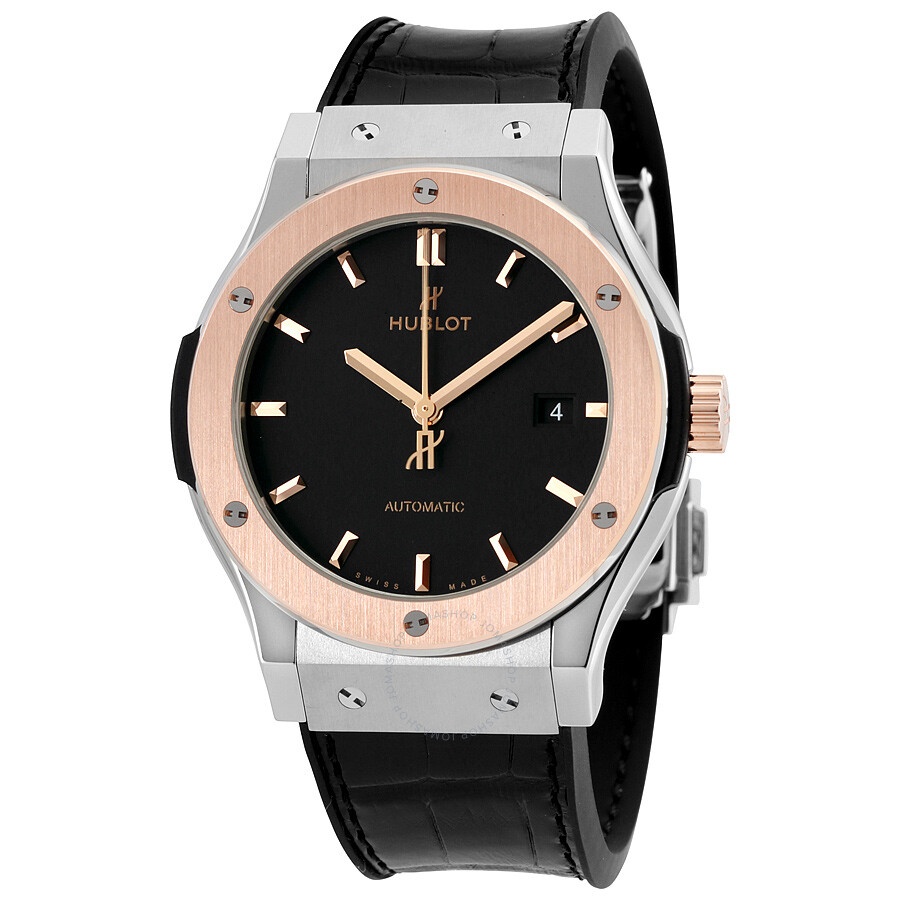 Grey titanium case with a black rubber strap withj a stiched black (alligator) leather top. Fixed 18kt rose gold bezel. Matte black dial with rose gold hands and index hour markers. Dial Type: Analog. Date display at the 3 o'clock position. Hublot calibre HUB1110 automatic movement, based upon Sellita SW300-1, containing 21 Jewels, composed of 63 parts, bitting at 28800 vph, and has a power reserve of approximately 42 hours. Scratch resistant sapphire crystal. Pull / push crown. Skeleton case back. Round case shape. Case size: 42 mm. Band width: 22 mm. Fold over clasp with a push button release. Water resistant at 50 meters / 165 feet. Functions: date, hour, minute, second. Classic Fusion Series. Luxury watch style. Watch label: Swiss Made. Hublot Classic Fusion Automatic Matte Black Dial Men's Watch 542.NO.1181.LR. GENERAL Box Type: Original Box CASE Case Size: 42 Case Material: Titanium Case Shape: Round Case Back: Skeleton BAND Band Material: Rubber with a Black (Alligator) Leather Top Band Type: Strap Band Color: Black Band Width: 22 mm Clasp: Fold Over with Push Button Release DIAL Dial Color: Matte Black Type: Analog Crystal: Scratch Resistant Sapphire Hands: Rose Gold Dial Markers: Index Bezel: Fixed Bezel Material: 18kt Rose Gold Crown: Pull / Push INFORMATION Brand: Hublot Series: Classic Fusion Collection Name: Classic Fusion Gender: Mens Model: 542.NO.1181.LR Watch Label: Swiss Made Movement: Automatic Engine: Hublot Calibre HUB1110 Power Reserve: 42 hours FEATURES Water Resistance: 50 meters / 165 feet Calendar: Date display at the 3 o'clock position Functions: Date, Hour, Minute, Second Watch Features: Alligator Leather, Analog, Gold, Leather, Rubber, Titanium ADDITIONAL INFO Watch Style: Luxury Warranty: 2 Year Jomashop Warranty UPC Code: 845960096591 Jomashop Sku: HB542NO1181LR Department: Watches Category: Watches